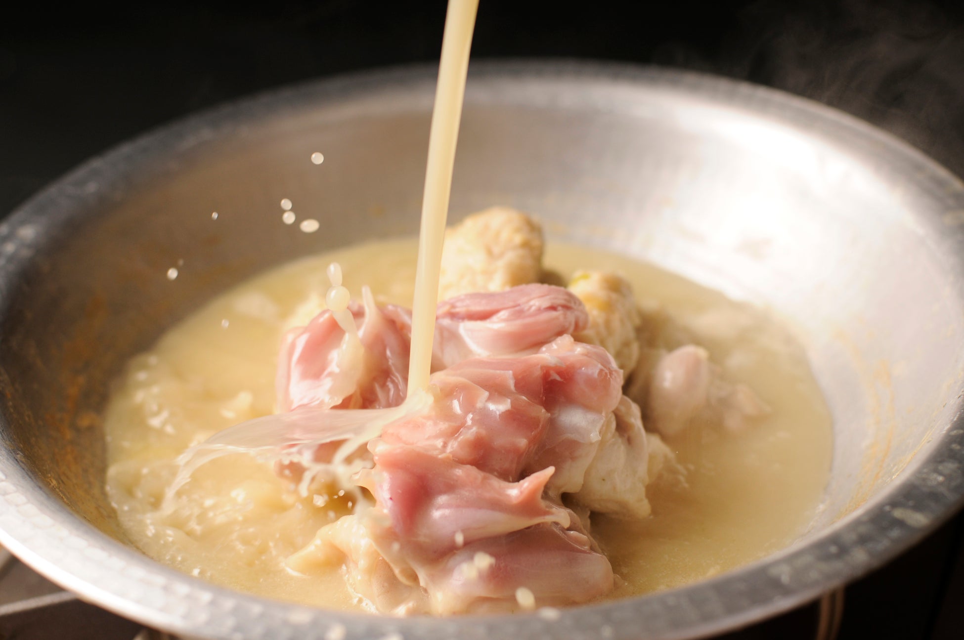 富士山の麓で産まれ、富士の名水で育った質の高い信玄鶏の旨味を存分に引き出した自慢の水炊き。鶏の旨みが凝縮したコクのある鶏ガラ白湯スープに、信玄鶏のもも肉、むね肉、つくねを入れ、産地直送の有機野菜ととお楽しみいただけます。
