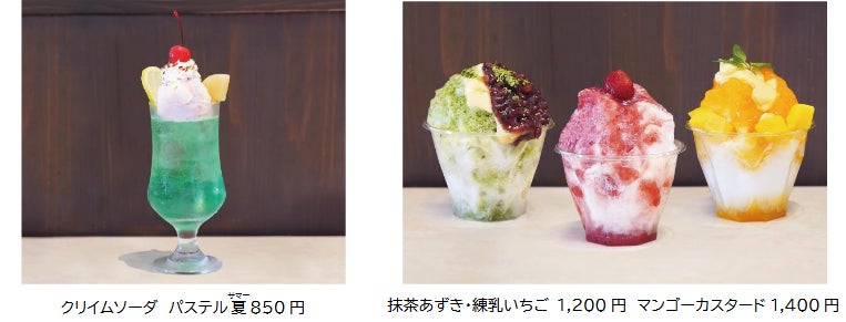 喫茶ビクトリヤでは大人気のクリイムソーダにパステル夏(サマー)が新登場!海をイメージしたエメラルドグリーンのソーダには、宝石のようなゼリーが隠れており、トッピングのレモンとパイナップルがさわやかな味を引き立てます。また、豊川氷店では、これまでの2倍の大きさのかき氷がおすすめ!この夏はちょっと贅沢に!お友達とシェアをしても楽しめます。