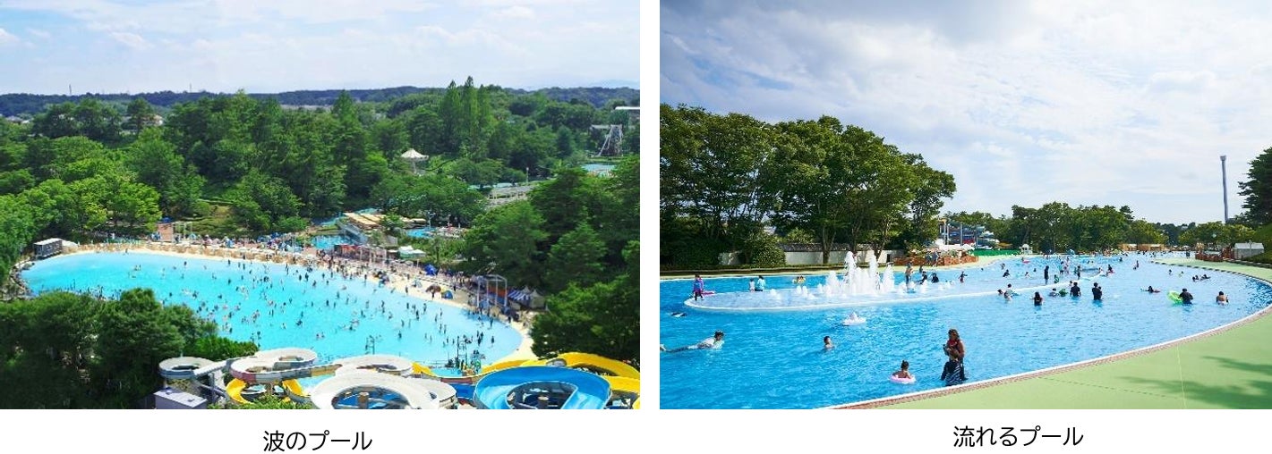 緑に囲まれた解放感あふれるプールエリアは、スプラッシュ!サマービートが行われる「波のプール」、1周500mの「流れるプール」、全6コースの「大回転!急流すべり台」(ウォータースライダー)、水深30cmの小さなお子さま向け「こどもプール」、温水の「おふねのプール」と5つのプールが体験できます。
