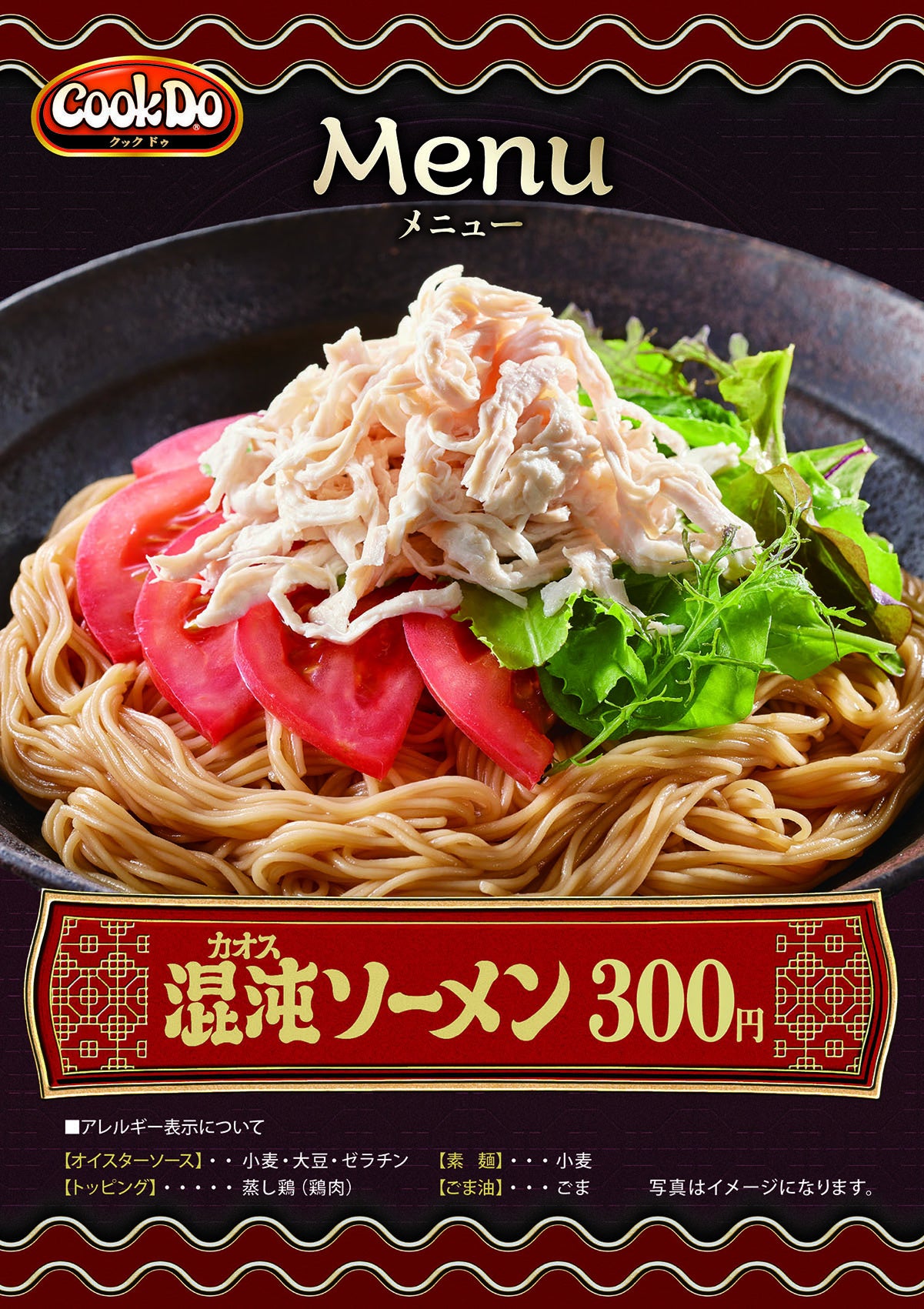 「そうめんを『Cook Do®』オイスターソースで食べるお店」では、「Cook Do®」オイスターソース・ごま油・レモン汁を合わせたたれをそうめんと混ぜ合わせ、蒸し鶏・トマト・ベビーリーフをトッピングした「混沌(カオス)ソーメン」を提供。「そうめん×『Cook Do®』オイスターソース」の組み合わせをランチや仕事帰りなどにぜひお楽しみください。