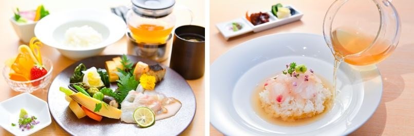 和食は厳選した昆布を時間をかけて煮出し、削りたての鰹節を加えた自家製のこだわり出汁と、瀬戸内産の真鯛を昆布締めし旨味を引き出した「真鯛の出汁茶漬け」。しっとりふっくらした「焼魚と奥出雲産の平飼い玉子のたまごかけご飯」の2メニュー。