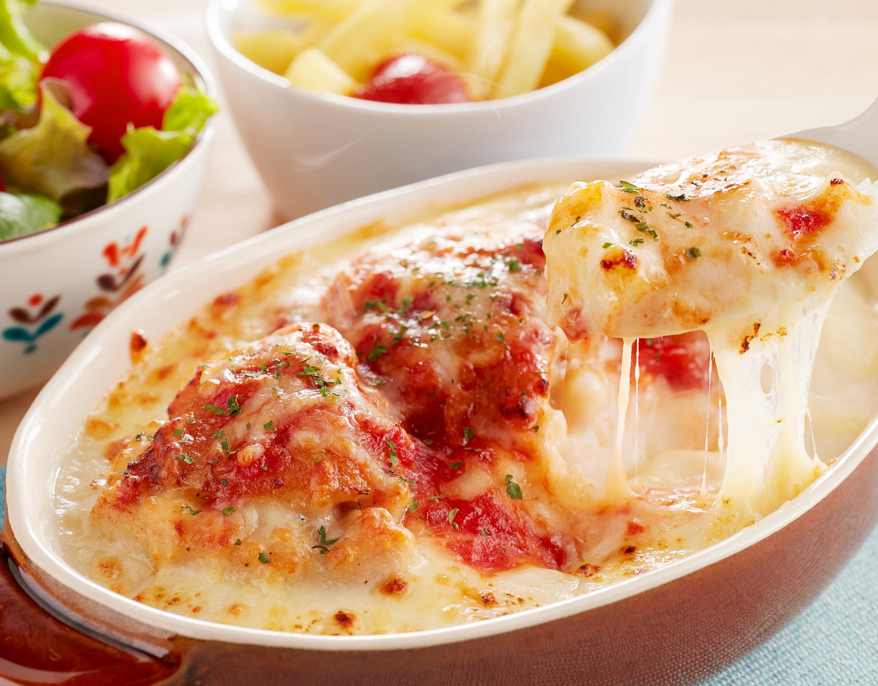 お子さまや女性から圧倒的な支持をいただいているジョイフルの代表メニュー。こだわりの熱々ソースと大きなチキン。そして、 “たっぷりとろっとチーズ” がたまらない一品です。
