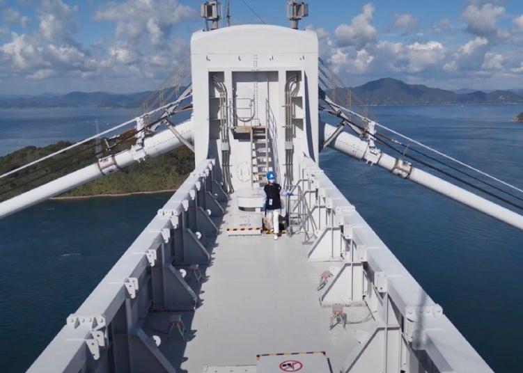 瀬戸内しまなみ海道に架かる吊橋・来島海峡大橋の、通常は立ち入ることのできない海上約 180m の塔頂へご案内いたします。