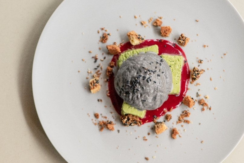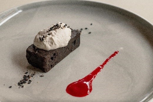 濃厚な黒ごまをエスプーマで軽やかに仕立て、見た目も華やかに。黒ごま、抹茶、グリオットが織りなす未体験の味わいをお楽しみいただける一品です。見た目以上に口当たり軽やかな、口の中でしゅわっと溶ける新感覚のスイーツです。