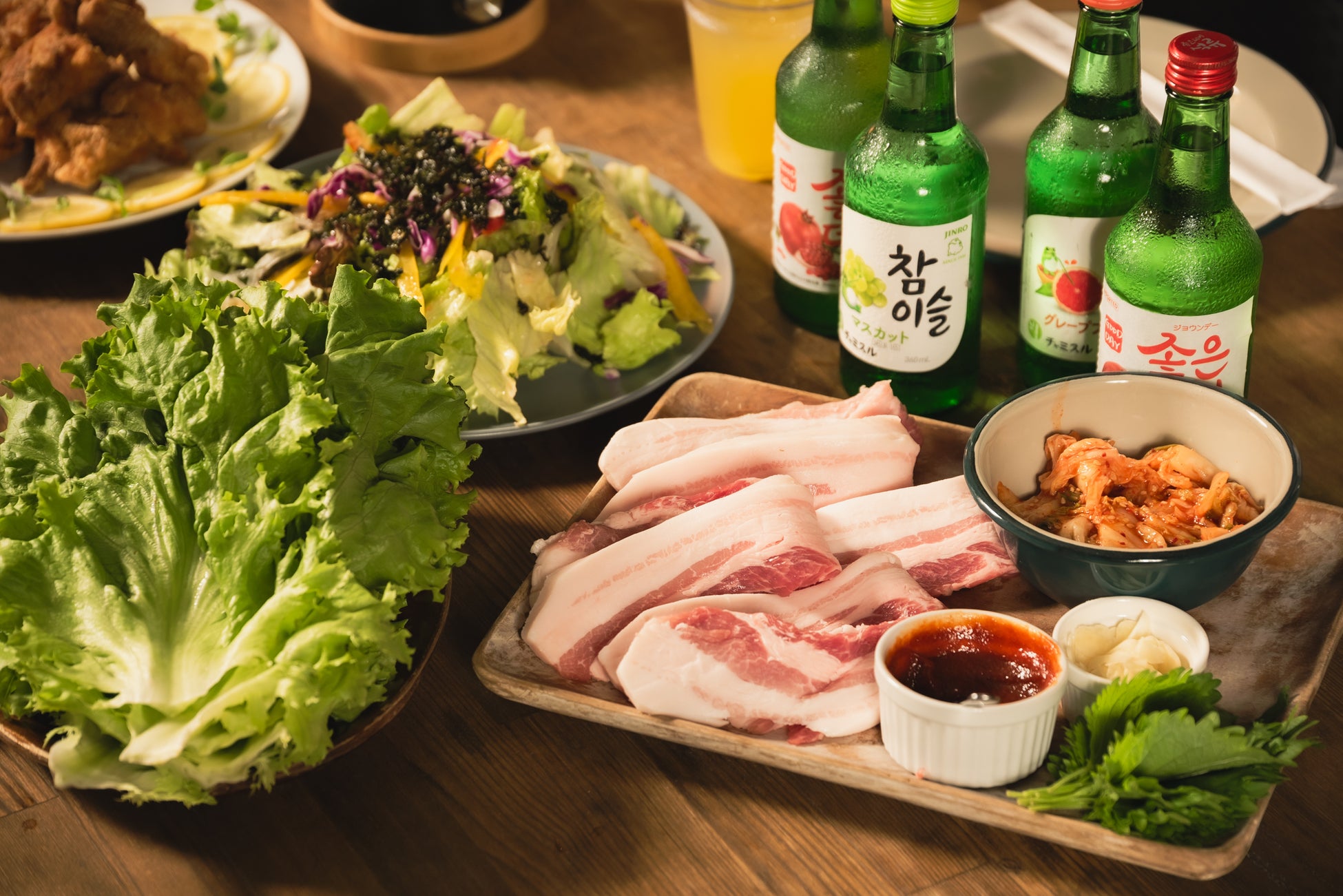 ビアガーデンのバーベキューメニューは、ボリュームたっぷりのサムギョプサルや韓国チヂミを始めとした韓国料理のフルコースをご用意。