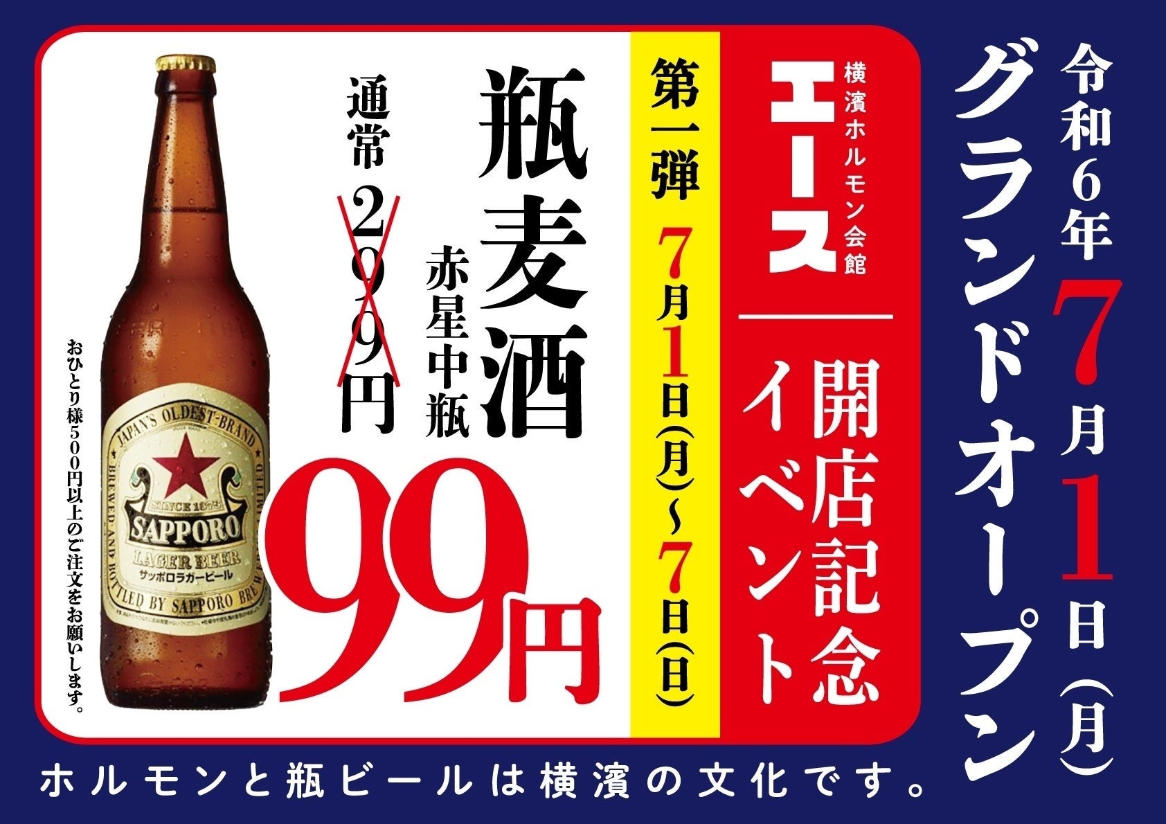 【開店記念!瓶ビールが99円】“ホルモンと瓶ビールは横濱の文化”《横濱ホルモン会館エース》が2024年7月1日(月)OPEN!