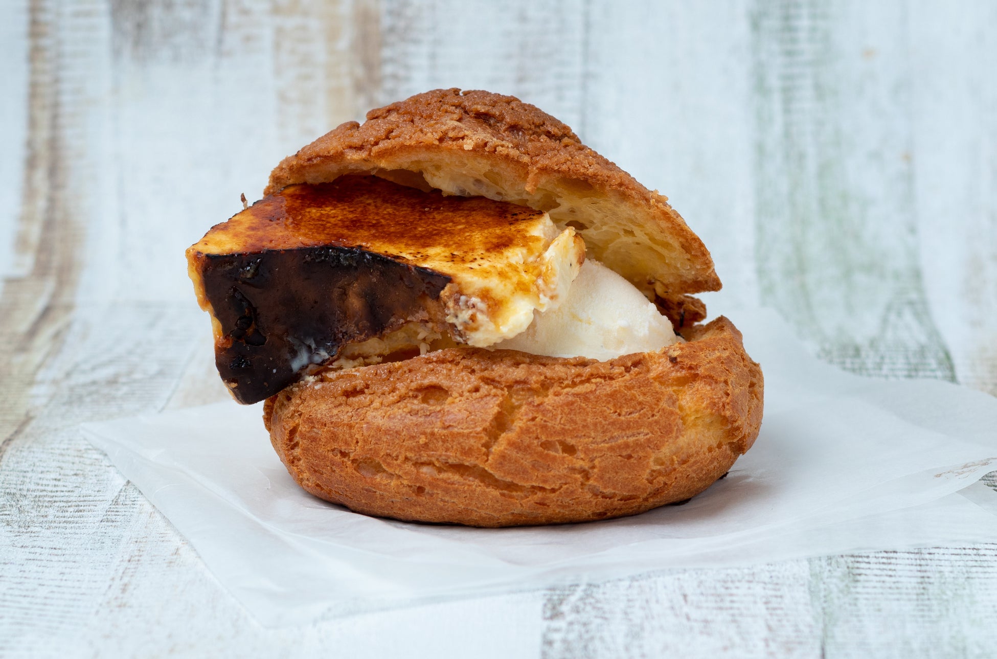 シュー生地に3種のドルチェをたっぷり詰め込みました。キャンディー状に包んで手土産にも。