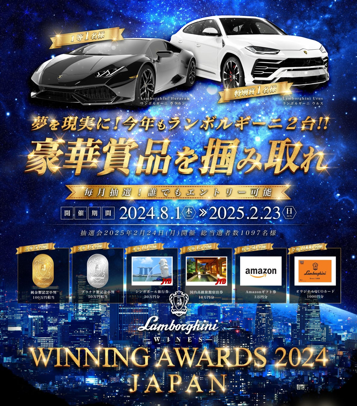 ランボルギーニワインの日本販売総代理店であるMarcheJapan株式会社(本社:東京都港区 代表:青山哲史)とパートナー企業でもある株式会社オーク、(本社:大阪府北区 代表:山口康二)株式会社マッシモ(本社:熊本市西区 代表:植田信之介)、株式会社Sclass(本社:仙台市青葉区 代表:半澤希望)が、今年で4回目を迎える夢のキャンペーン、ランボルギーニが本当にもらえる「Lamborghini Winning Awards 2024 JAPAN (ランボルギーニウイニングアワード2024ジャパン) 」を、2024年8月1日より開催いたします。