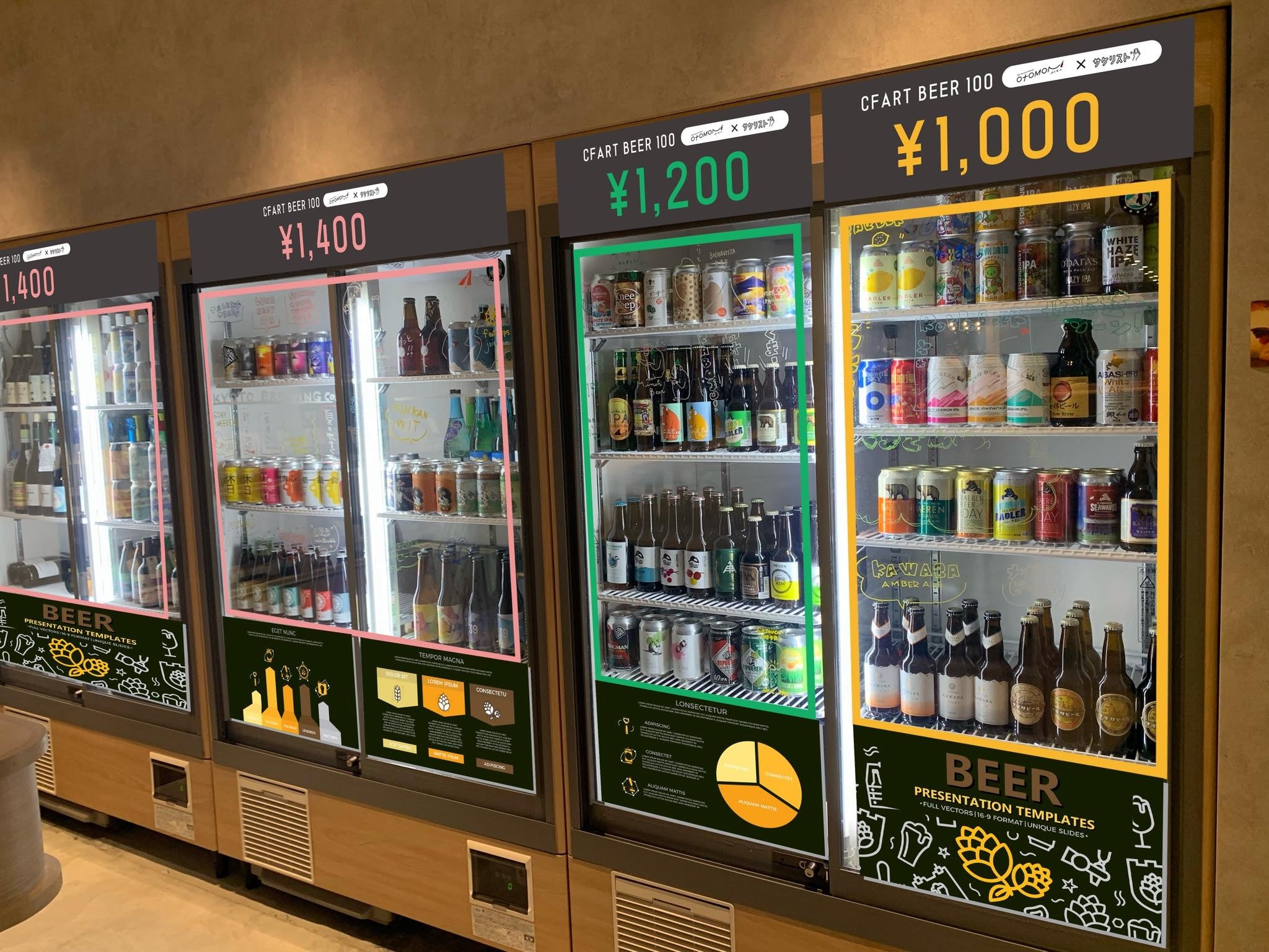 1.ショーケース型冷蔵庫に100種のクラフトビールを展示し、クリエイティビティの高いクラフトビールのボトルデザインを視覚的に楽しみます。