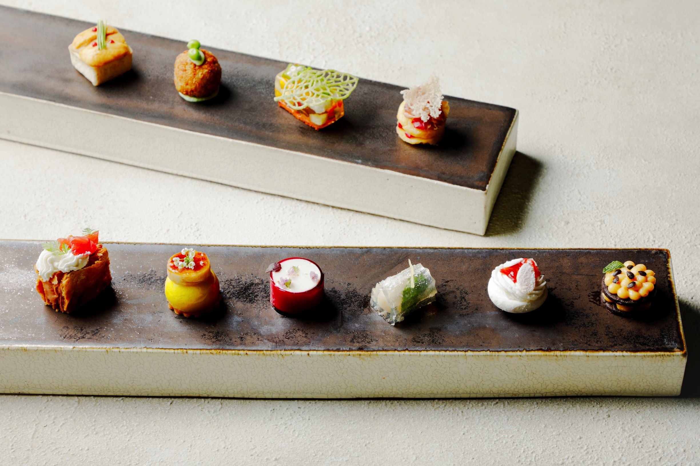アマン京都の庭でシェフが摘んだ山椒のトニックウォーターにはじまり、お重の1段目には、プレミアムな厳選食材に、京都の夏野菜を合わせた総料理長の小澤達也こだわりの4種のセイボリーが並びます。愛らしい葉っぱが目を引く、彩り豊かな上賀茂と西賀茂の夏野菜テリーヌ、雲丹と賀茂なすのキッシュ、まろやかな京都産枝豆ソースでいただく鮑のアランチーニ、増田牛ブレザオラハムを添えた万願寺とうがらしのファーブルトンなど、洗練されたセイボリーをシャンパンとともにご堪能ください。