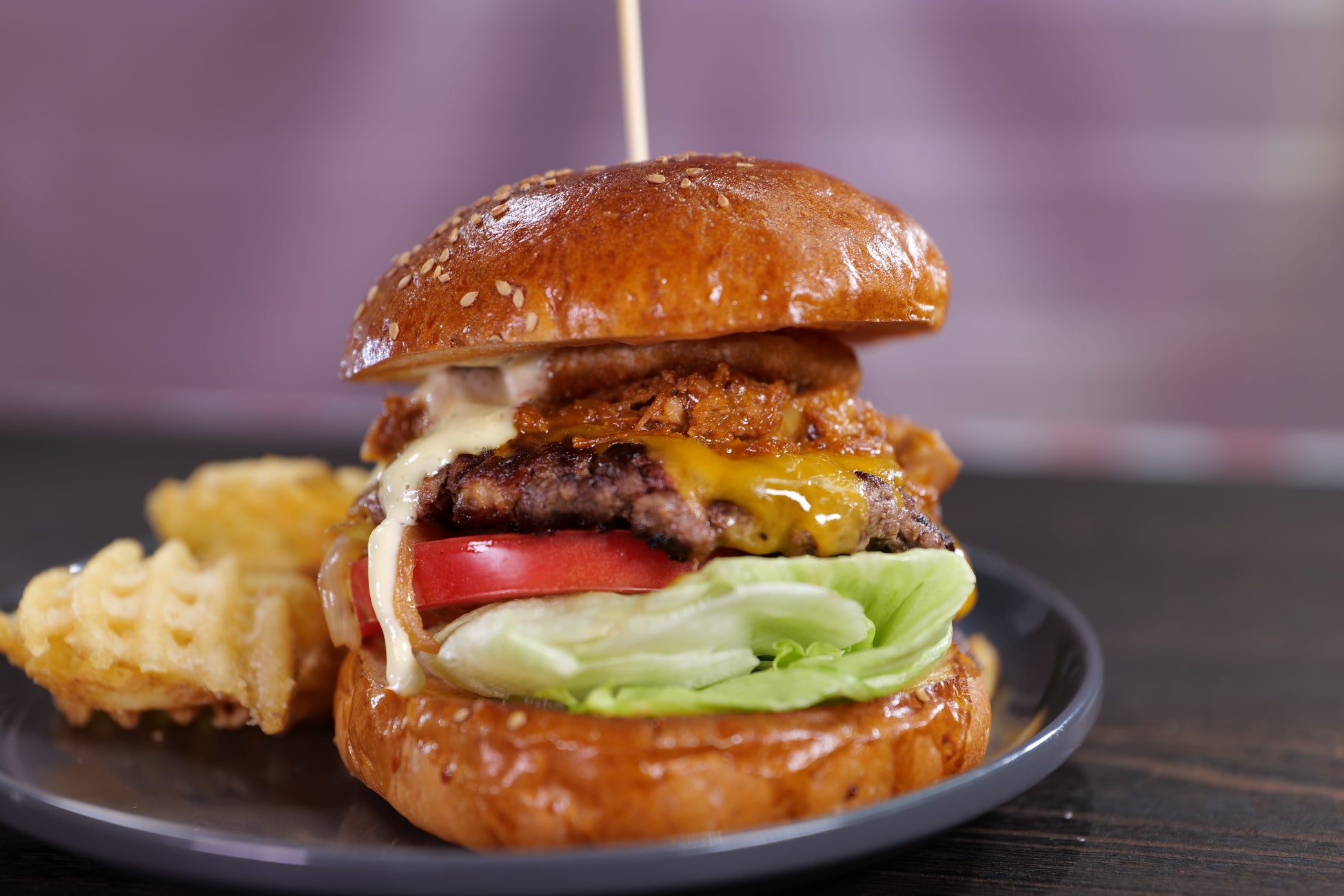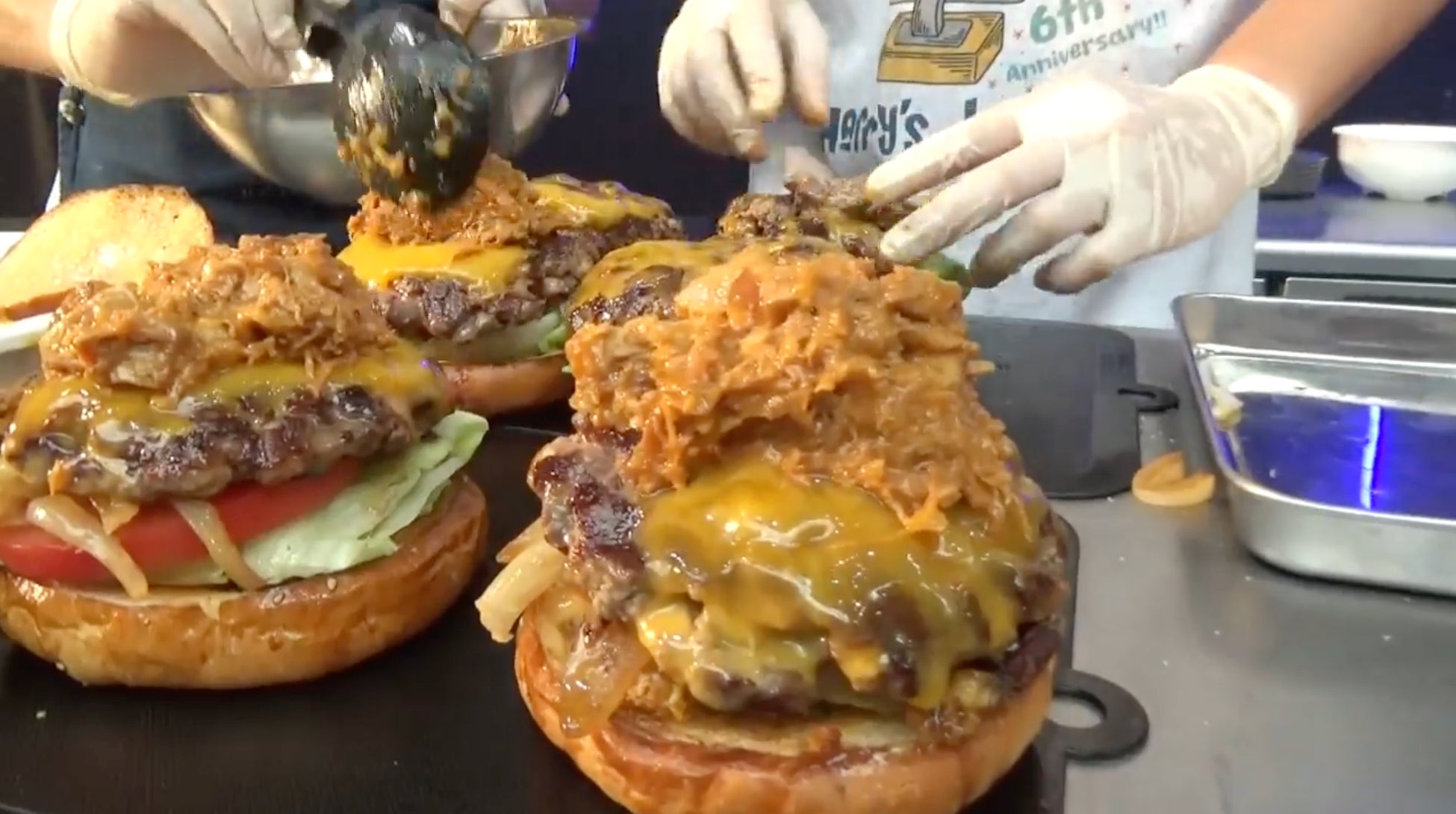 決勝ラウンドでは、日本ハム“グラフォア”が指定食材となり、「Harry‘s Junction」は、仙台牛のしんたま(もも肉)、国産牛チャックロール(かたロース)、焼いた“グラフォア”を入れ込んだパティ作りと、オリジナルハリーズソースでプルドポークと”グラフォア“角切りを混ぜた具材作りで、2通りの”グラフォア“の使い方にチャレンジ。バンズに、レタス、トマト、玉ねぎ、チーズに覆われた特製パティの上に、さらにオニオンリングにオリジナルランチソースをかけた「グラ for you バーガー」を完成させました。佐藤シェフは「バランスよく仕上がっているので豪快にかぶりついてほしい!」とコメントしました。
