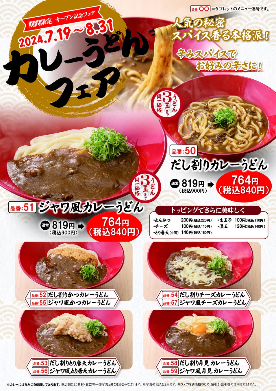 また、7月19日(金)から8月31日(土)までの期間限定で、人気の「カレーうどんフェア」を開催します。さらに、お子様向けメニューが半額となるキャンペーンも実施いたします。