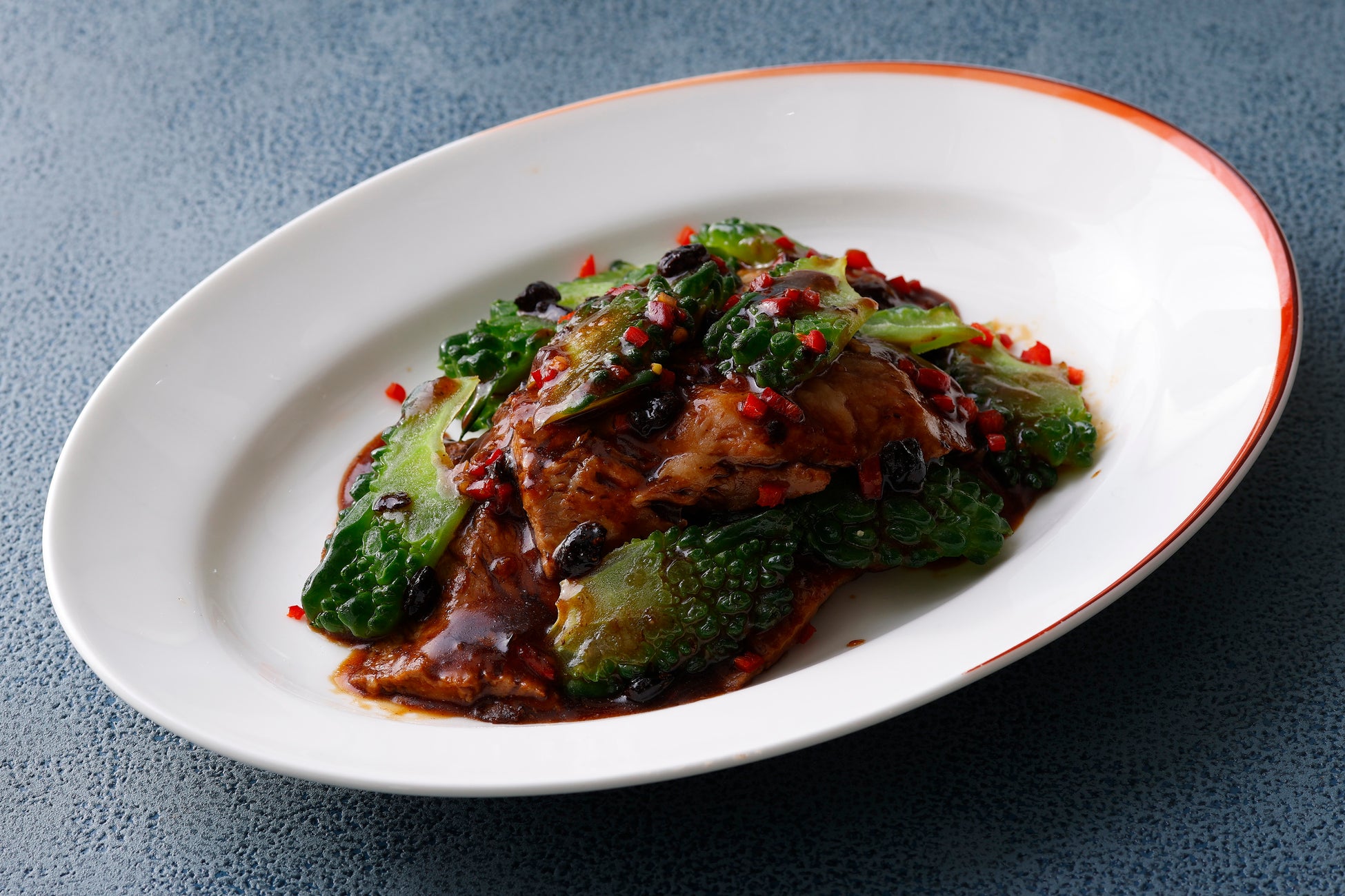 和牛のサーロインに、身体を涼しくさせるといわれる苦瓜と茄子をあわせて、味わい深いブラックビーンズ炒めで仕上げたメイン料理です。