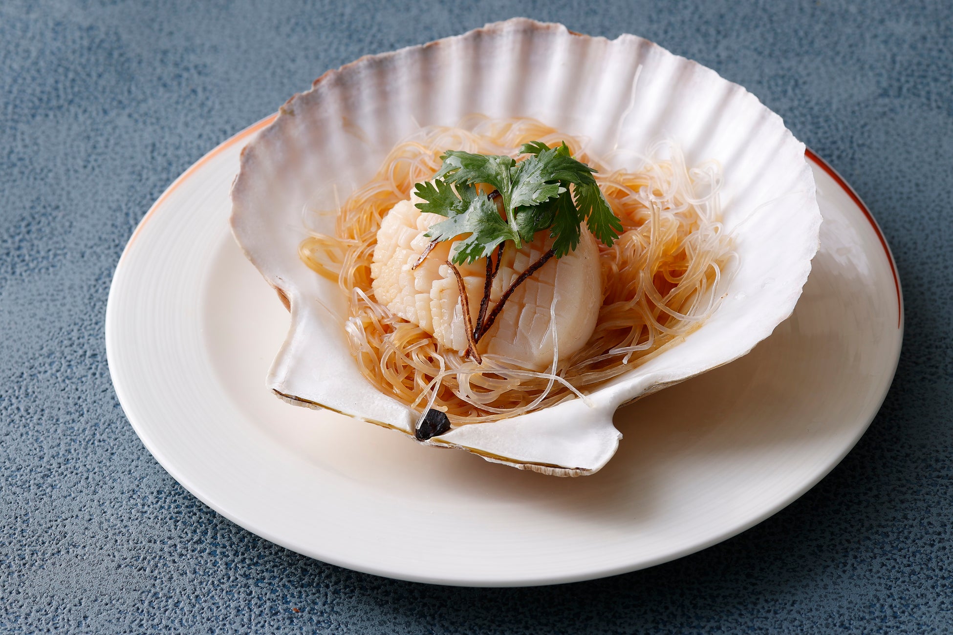 産地より直送する大振りの帆立を水槽から取り出してすぐに蒸篭でさっと蒸し、香港ならではの魚醤ソースを。香り高いガーリック醤が食欲をそそります。