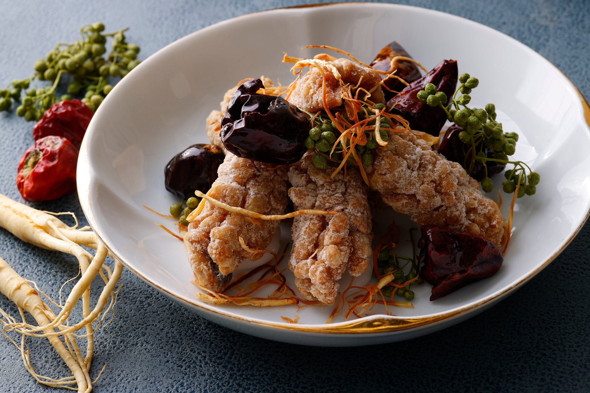 滋養効果がうたわれる鰻を、青山椒ととうがらしで香り付けしたスパイスソルトで炒めました。揚げた朝鮮人参を添えてお召し上がりいただきます。