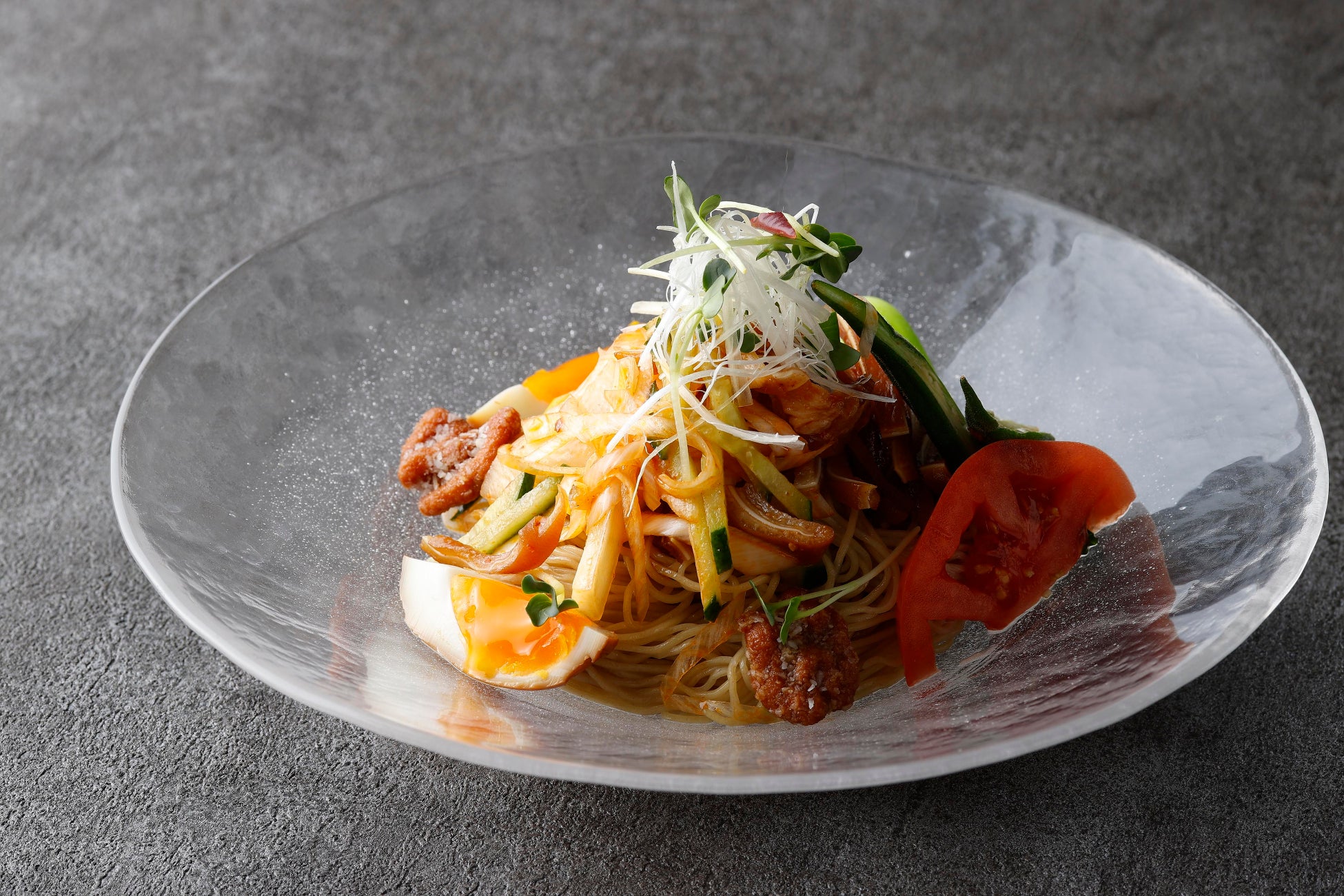 本場中国出身の焼き物師が作るコラーゲン豊富な豚耳の焼き物は、八角や桂皮など十種類以上のスパイスをブレンドした特製醬油たれで煮込みました。醤油と豆板醤、お酢の芳醇な風味と辛みのソースが絡まった香港麺と、豚耳の焼き物、夏野菜とのバランスが相性抜群の冷麺です。