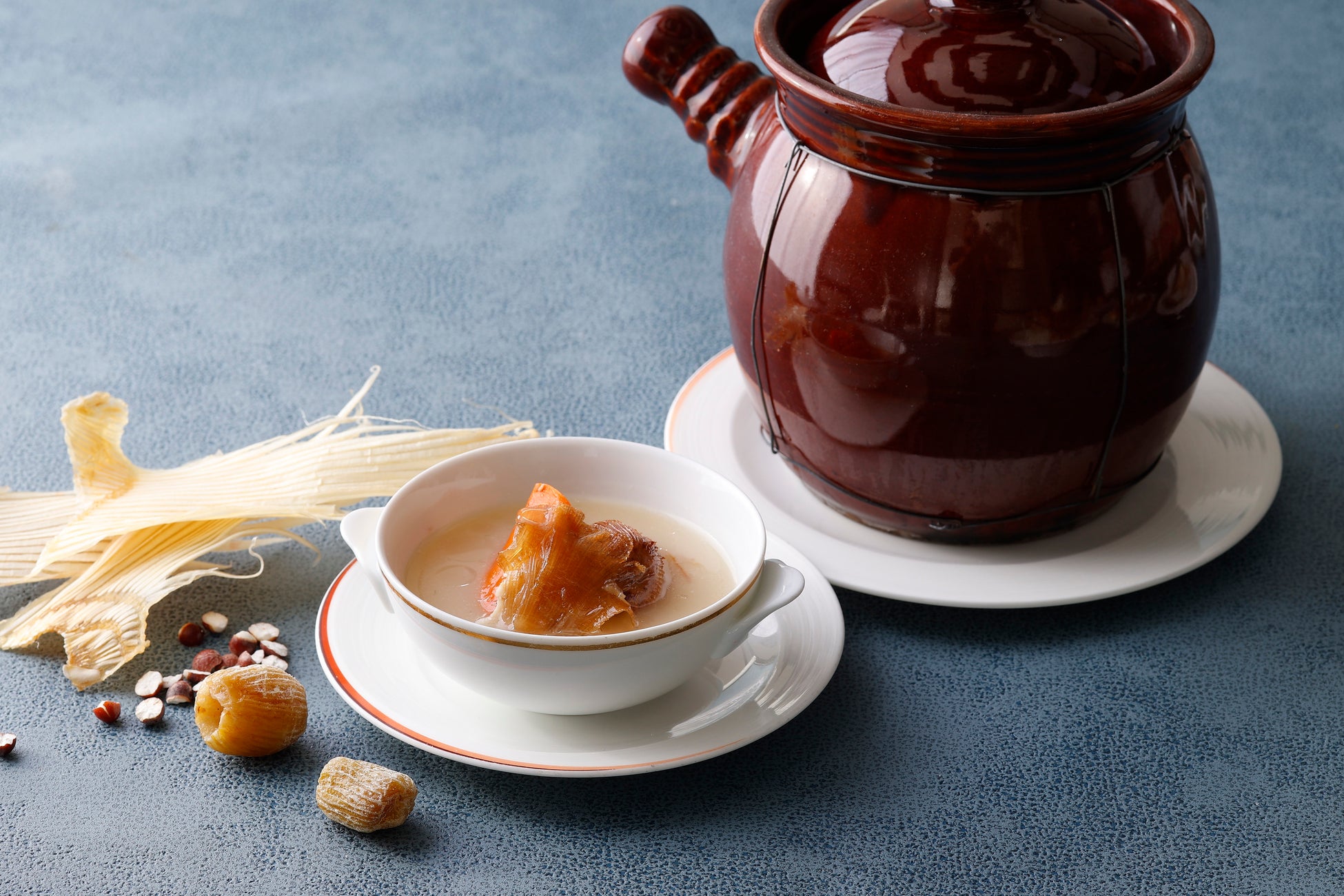 身体の熱を取るといわれている魚のコラーゲンが潤いたっぷりのやさしいスープ。疲れを取り養生にも良いといわれる鬼蓮の実と一緒に壺で時間をかけてじっくりと炊き込んだ一品。