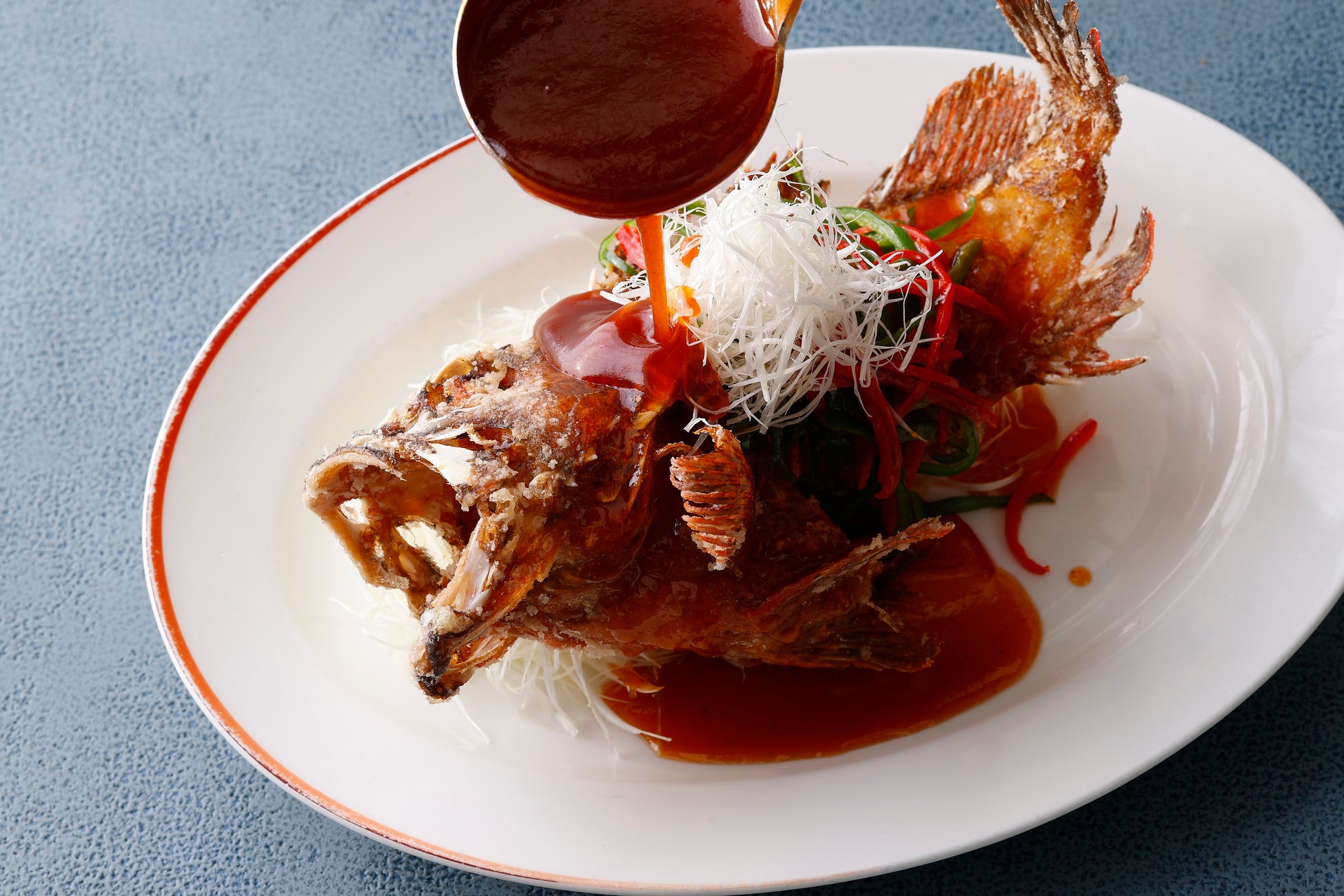 旬の魚を産地から直送し、新鮮なまま丸揚げ。サンザシや香港の高級黒糖などでつくるオリジナルの甘酢で仕上げ、最後にさっぱりと召し上がっていただきます。