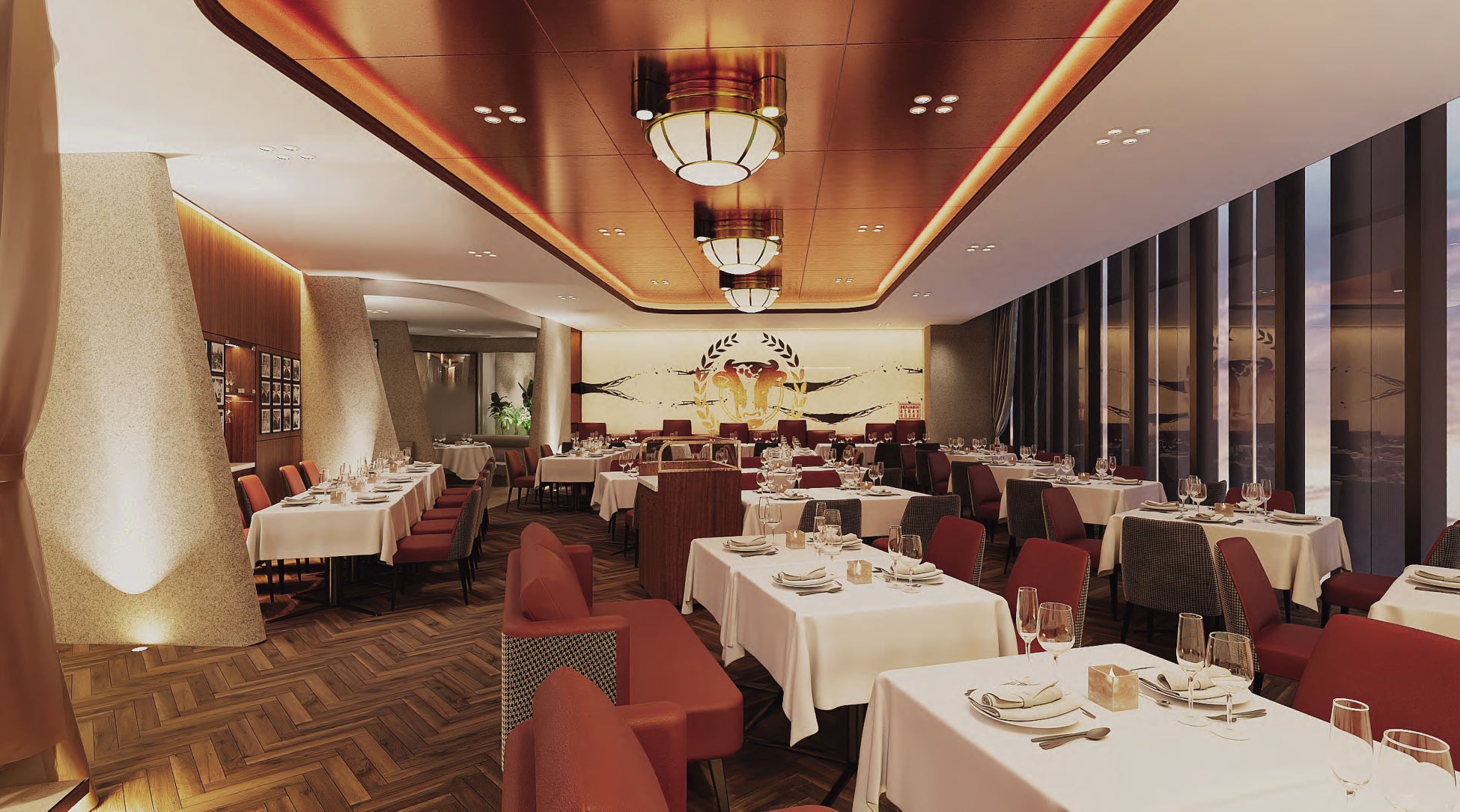 「ベンジャミン ステーキハウス KITTE⼤阪」は、ニューヨーク本店の雰囲気を漂わせる⾼級感と、
