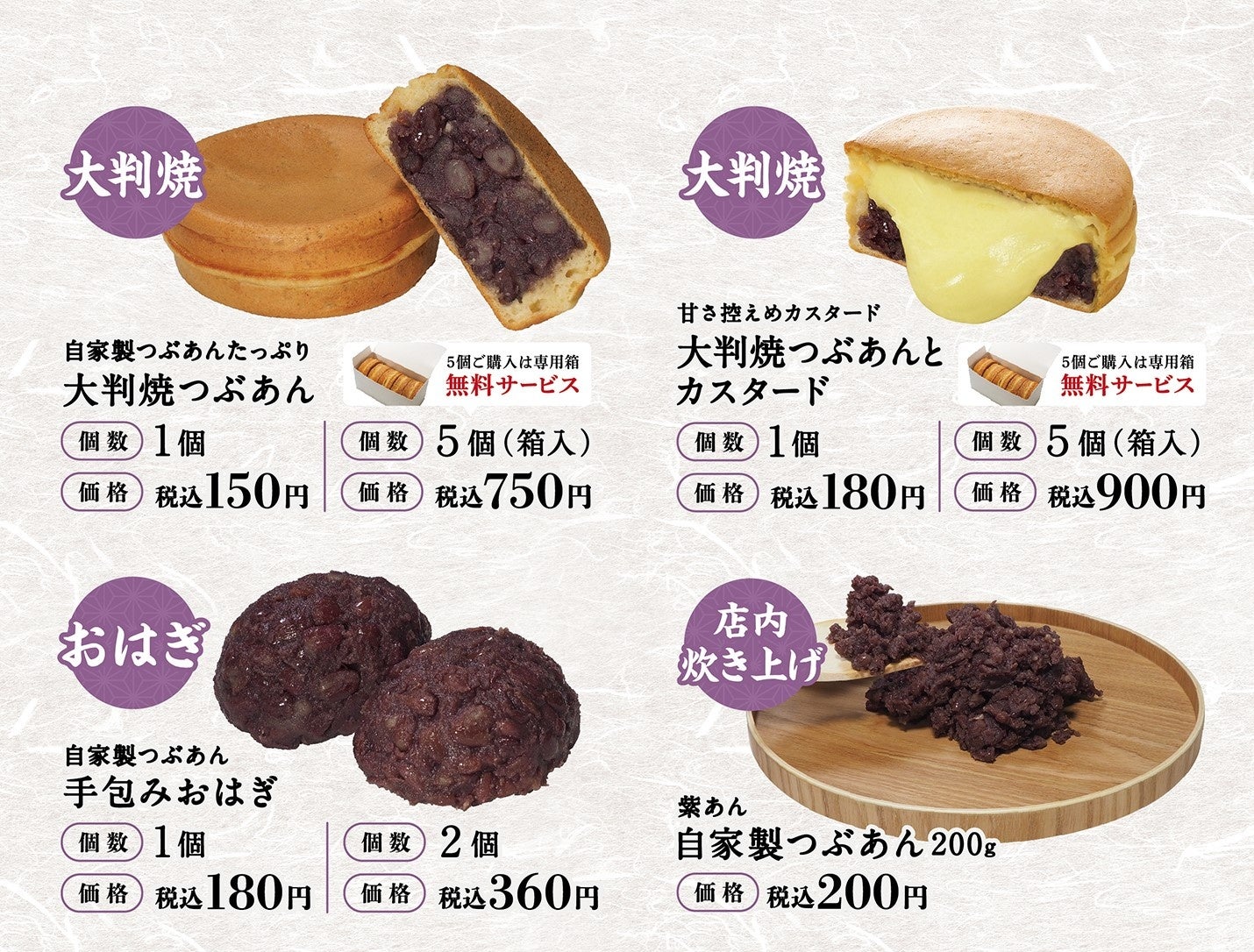 当社は、テイクアウトを主体としたファーストフード業態を新たな成長戦略と位置づけ出店強化を進めております。『紫あん』は、素材・製法にこだわり、店内で丁寧に炊き上げた甘さ控えめな”自家製つぶあん”がコンセプトの「あん専門店」です。この度、5号店目となる『紫あん』柏店では、お客さまからご好評いただいている「大判焼」2種類と「おはぎ」に特化し、ギフト用の包装紙や手提げ袋を刷新し、手土産などへの贈答需要への対応を強化しております。小豆本来の美味しさを味わえる、親しい方への手土産やおやつ、小腹満たしにもぴったりの商品です。