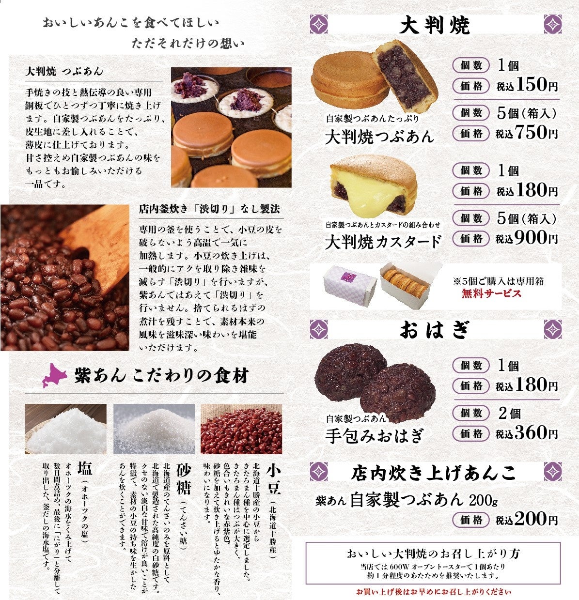 『紫あん』のつぶあんは、素材を厳選し、甘さを抑え小豆本来の風味を引き立たせるため、あえて「渋切り」をせず、店内で丁寧に炊き上げています。十勝産小豆にてんさい糖と少量のオホーツク産塩を加え、北海道の恵みが凝縮したやさしい味わいの、保存料無添加の自家製つぶあんをお届けします。
