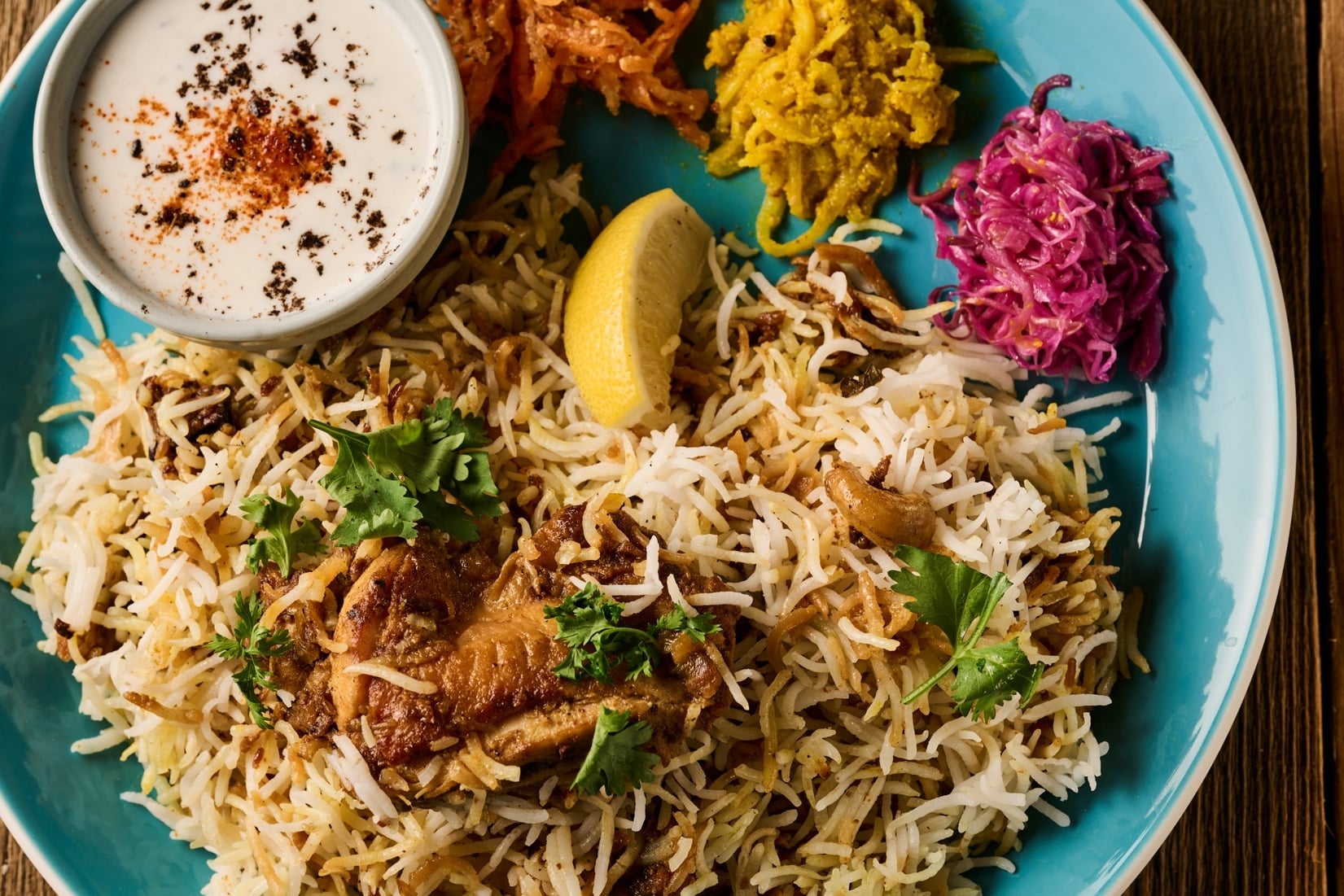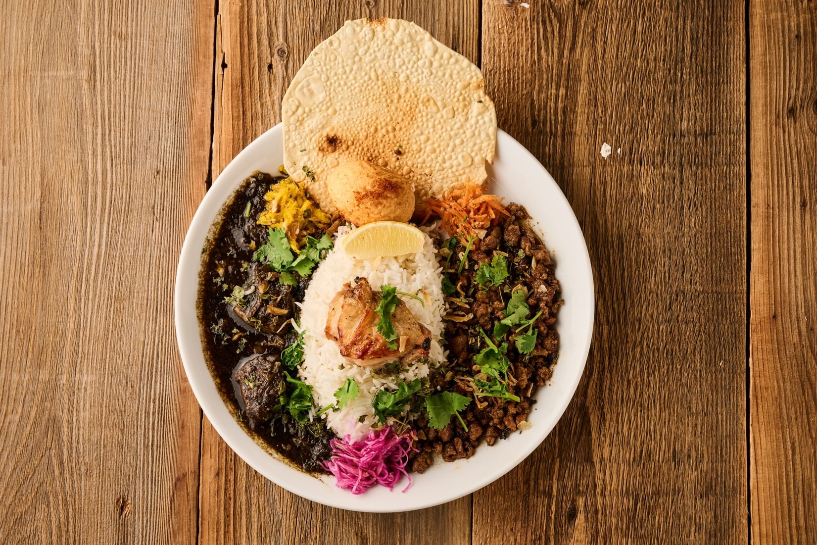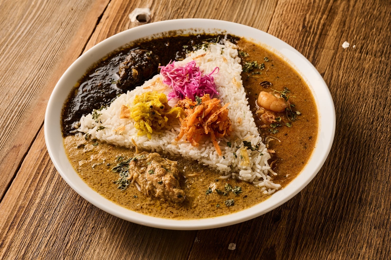 自慢のスパイスカリーは全6種類。「コルマミルチー」、南インド発祥の酸っぱ辛くコクのある一番人気「ポークビンダルー」、豆カリーにあおさと海苔で和をプラス、海の旨みしっかりサラサラ食べられる「ダルとあおさ海苔」などに加えて、1日30食限定の「ビリヤニ」と野菜の旨みが溶けだしたスープタイプのカリー「ベジタブル」も揃えます。