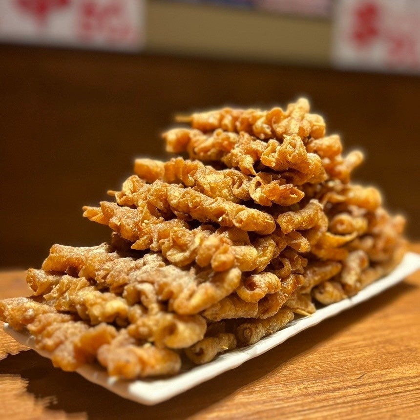 『新時代』にご来店頂いた方が必ずといっていいほど、ご注文頂くのが『伝串』です。伝串は、1本50円の揚げ鶏皮串です。一度食べると、やみつき。思わず何本も食べたくなり、平均お一人5本以上ご注文頂く、名実ともに名物商品です。