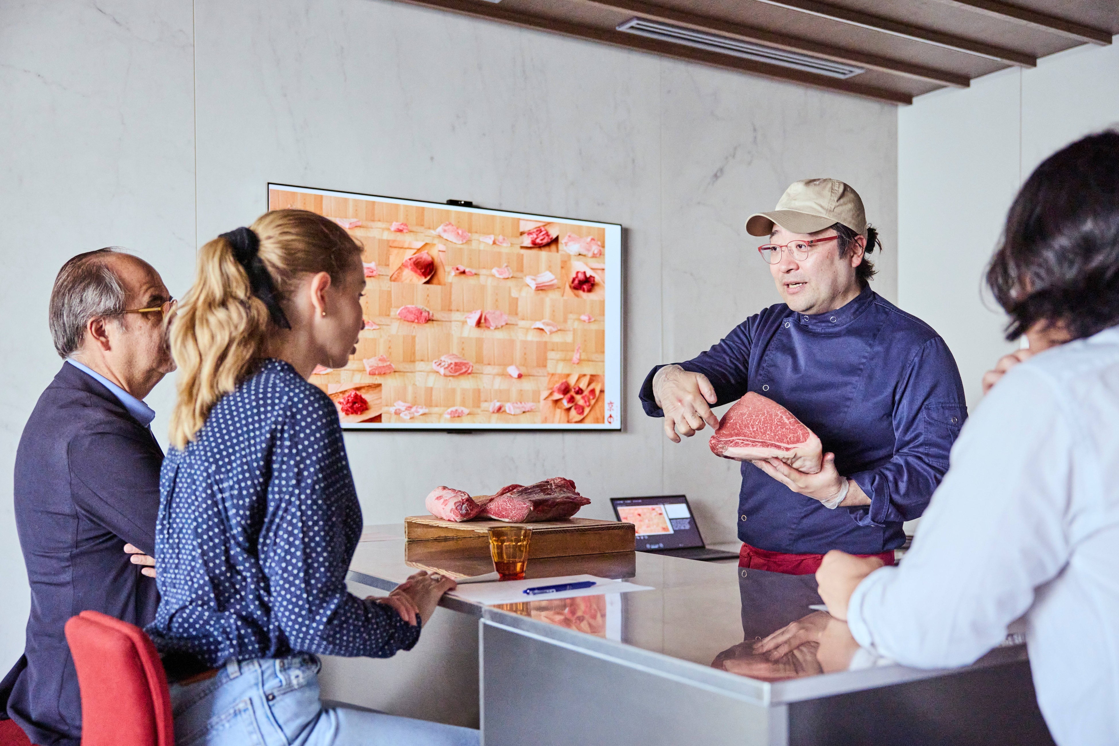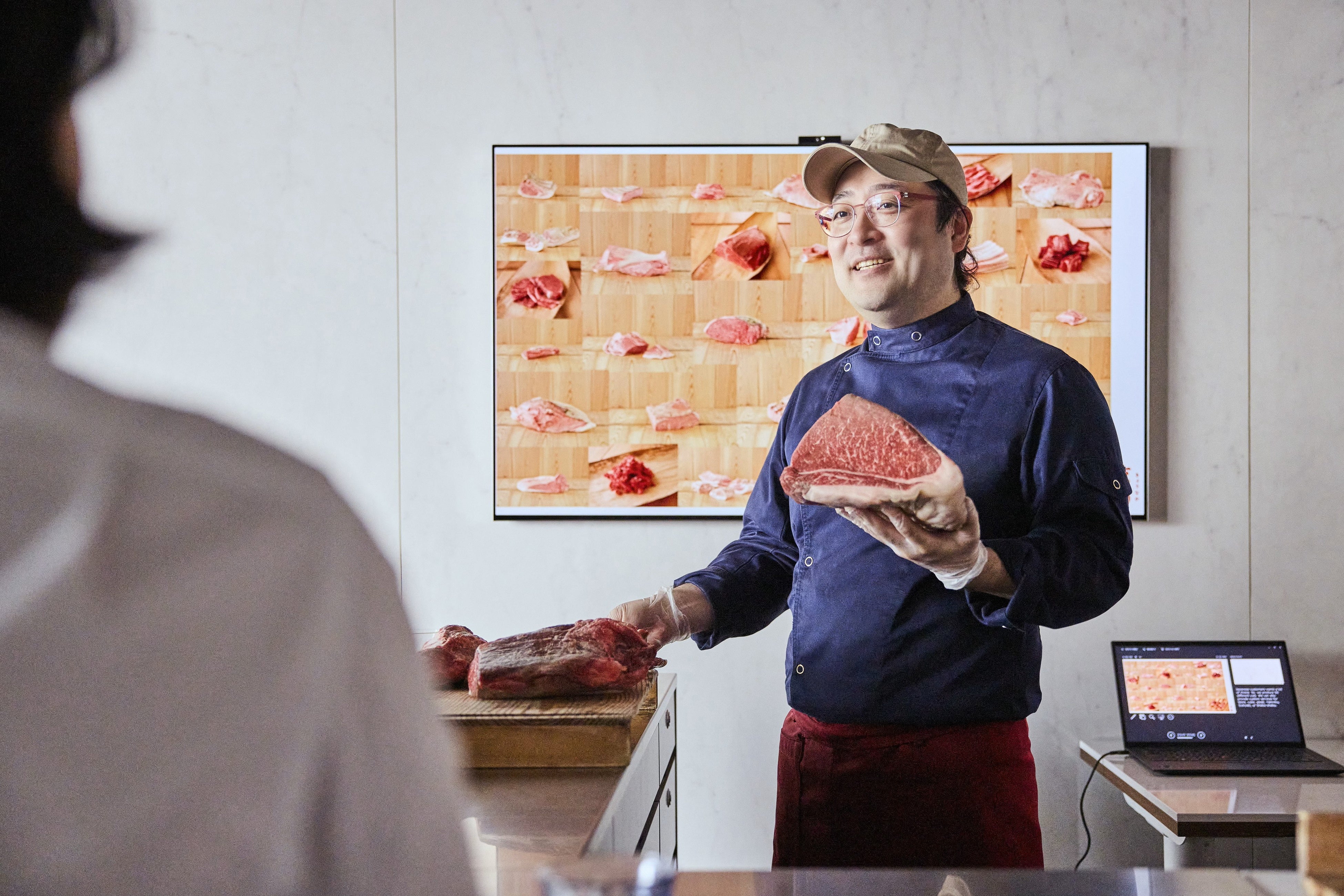 【⾁サロン】 ⾁セミナーと⾁ワークショップを通じて、⾁の知識と経験を共有し、お⾁を⾷べる喜びをお客さまと共に追求します。和⽜の存在意義や熟成⾁の魅⼒について学び、実際にご試⾷いただき味わいながら、お⾁の奥深さを体験できるプログラムをご⽤意しています。特に、お肉のおいしさのコーチングによって、部位や焼き具合によるお肉のおいしさの違いをわかりやすく味わっていただけます。