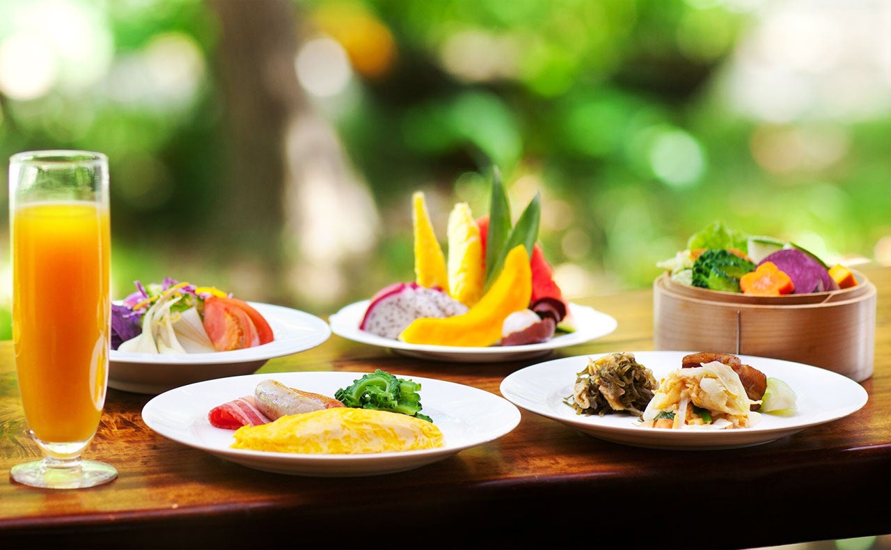 ブレックファーストブッフェ(7:00-10:00)美と健康をテーマに体に優しい沖縄食材をふんだんに使う朝食。せいろで蒸したアツアツ島野菜や中華粥、生絞りジュースなどヘルシーに。