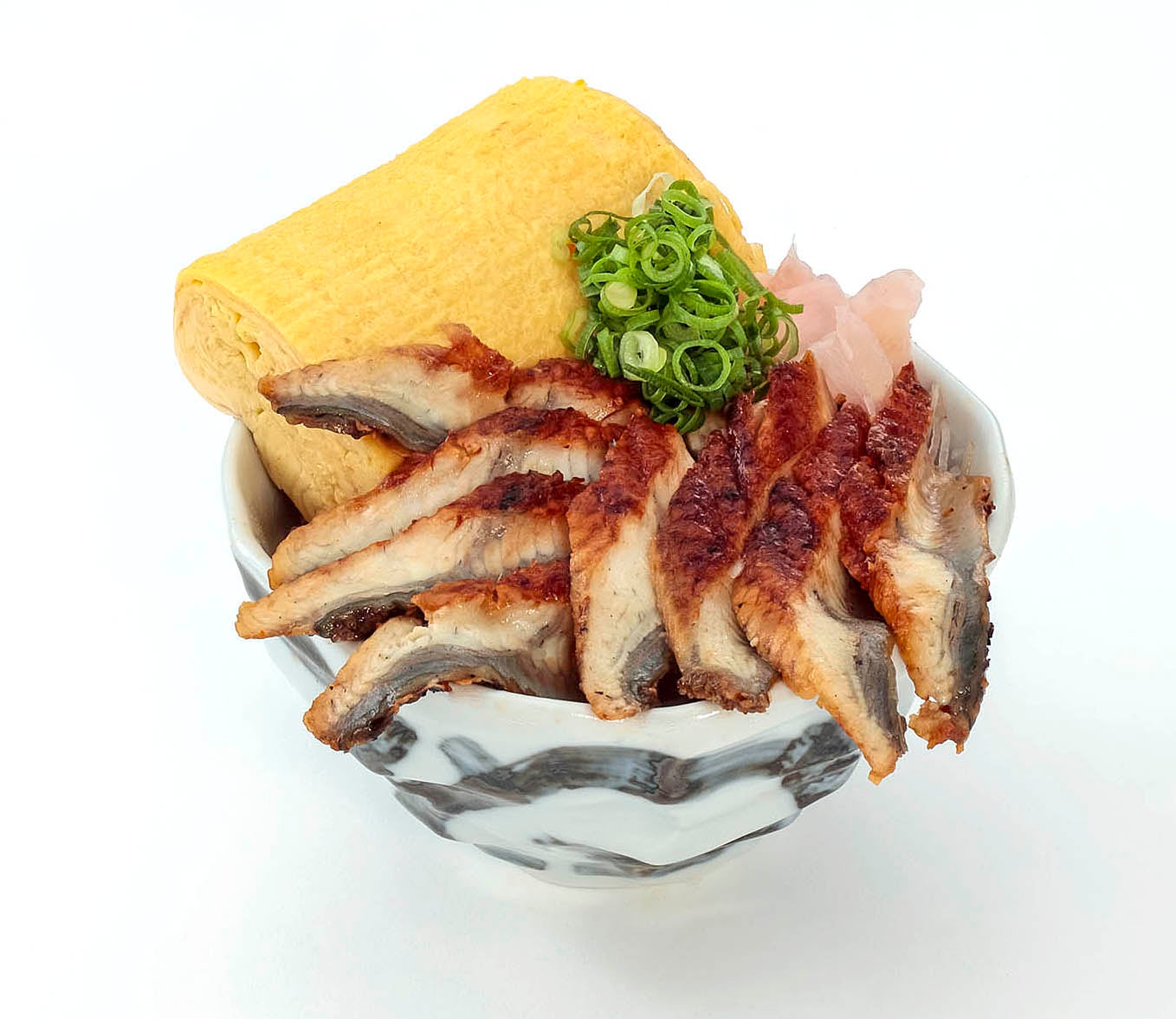 丼からはみ出すサイズのふわふわ出汁巻き玉子と、香ばしく焼き上げた鰻の蒲焼きを合わせました。鰻と出汁巻きの相性は抜群です。