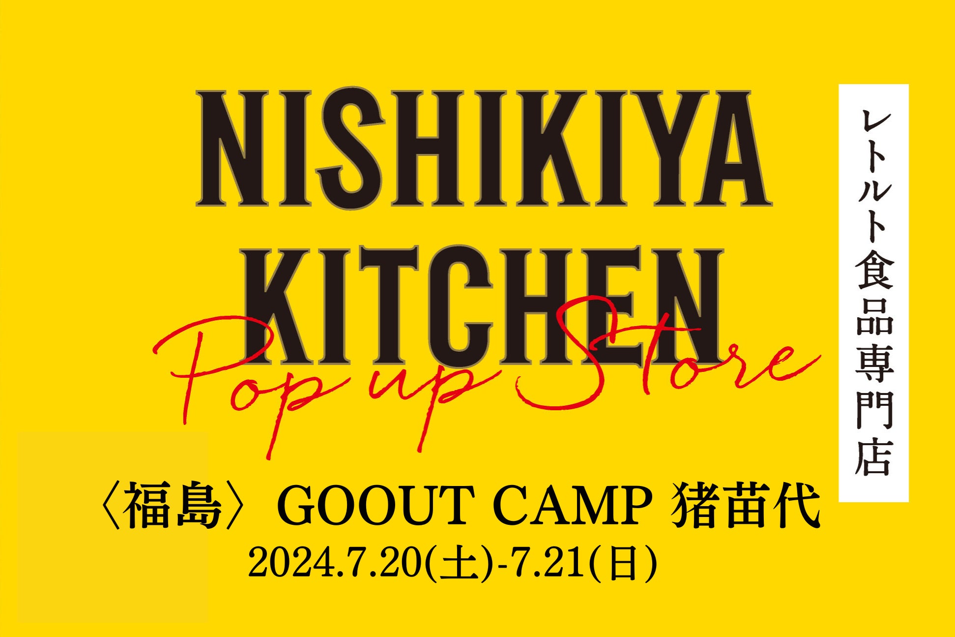 「世界の料理を『カンタン』に。」をコンセプトに掲げ、レトルトカレーを中心に販売するレトルト食品専門店NISHIKIYA KITCHEN(ニシキヤキッチン)(株式会社にしき食品 本社:宮城県岩沼市、代表取締役:菊池洋)は、福島県・天神浜オートキャンプ場にて開催される「GOOUT CAMP猪苗代」へ2024年7月20日(土)~2024年7月21日(日)に初出店します。福島県への期間限定出店は今回が初めてです。