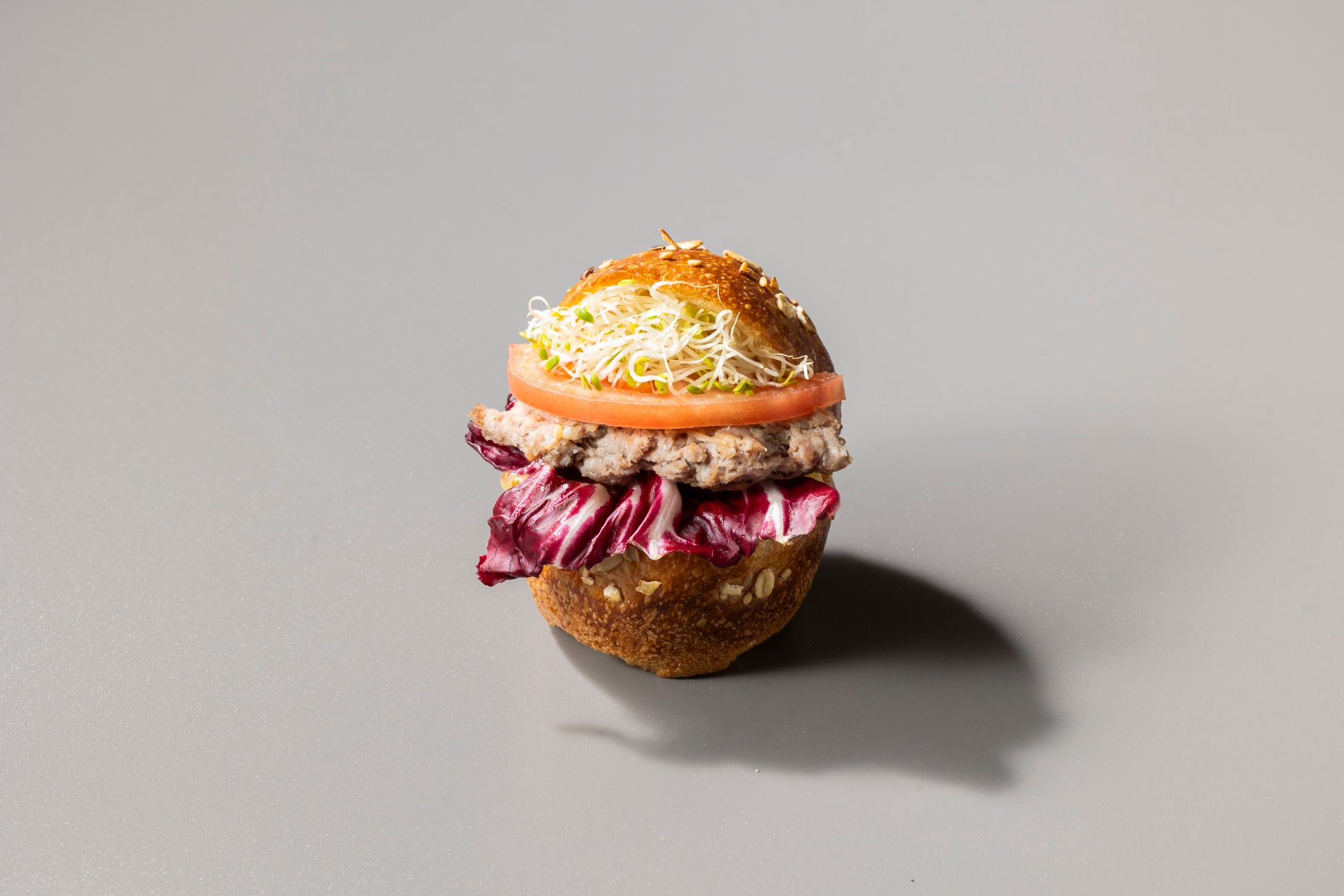 スパイスがほんのり効いた自家製のサルシッチャとトレビス、トマト、アルファルファをサンド。小さなバーガーながら食べごたえがしっかり。