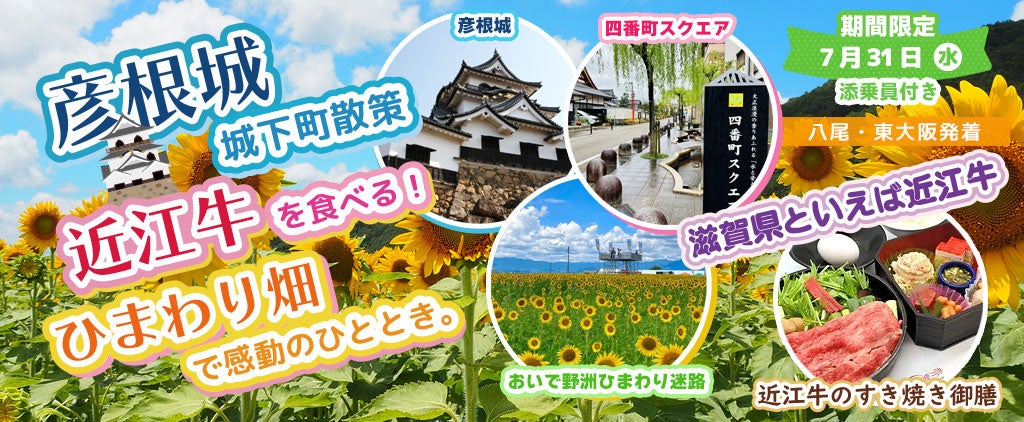 〈東大阪・八尾 発着〉7月31日(水) お一人様13,800円!彦根城城下町散策と近江牛を食べる‼️ひまわり畑で感動のひととき。〈添乗員付き〉日帰りバスツアー