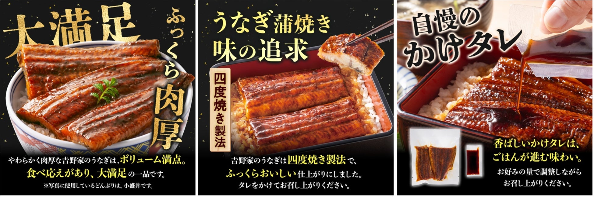 「冷凍うなぎ蒲焼」は、長年愛されている吉野家店舗の「鰻重」と同様の製法で焼き上げました。滋養豊富な鰻の頭を煮詰めてうま味を抽出したエキスを加えたコクのある特製たれに大判なうなぎをくぐらせて四度焼きし、ふっくら香ばしく焼き上げています。個包装した特製たれ付きです。お好みでたれをかけながら、お楽しみください。