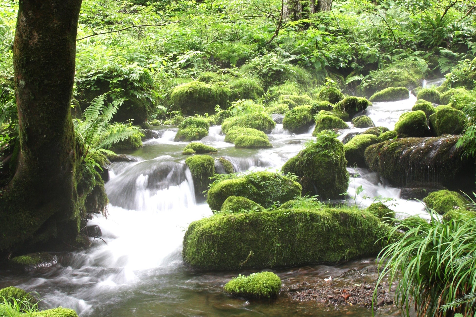 大山には西日本最大級の面積を誇るブナ林があり、雪解けの水が大山という栄養価に富んだ土壌で濾過され、地中深くまでしみ込んでいます。木谷沢渓流は、奥大山を象徴する「ブナ」と「水」の2つの重要なファクターが体感できるポイント。遊歩道を散策するとブナやミズナラ、ケヤキなど広葉樹の巨木の緑が広がっており、渓流のせせらぎと苔むした岩、小鳥のさえずりが非日常の空間を創り出しています。