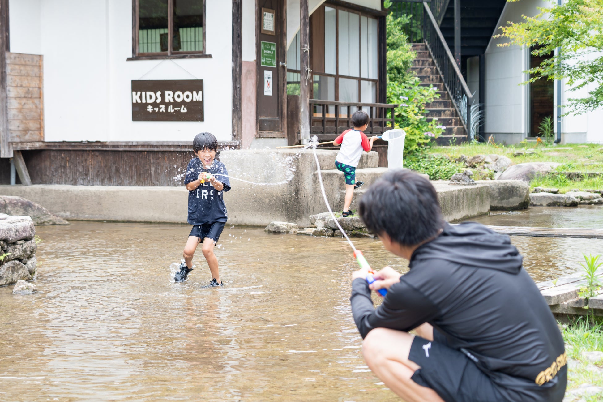 シンボルの茅葺の建物がある施設内は小川が流れ、水遊びしながら手ぶらバーベキューが楽しめます。