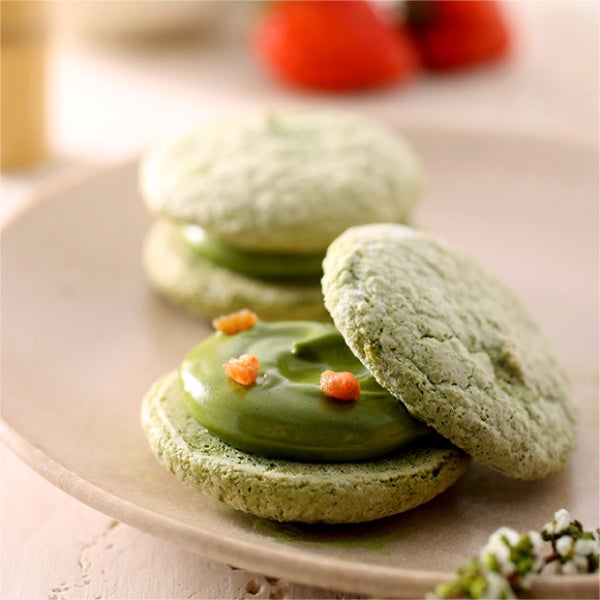 宇治の〈北川半兵衛商店〉が独自につくりあげた抹茶「京の鶯」を使用。ダックワーズ生地にお濃茶クリームを挟み、苺果肉をアクセントに。