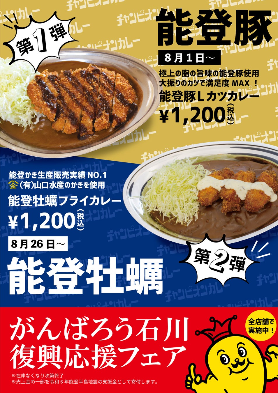 株式会社チャンピオンカレー(本社:石川県野々市市、代表取締役:南 恵太)は、2024年8月1日(木)より、「がんばろう石川 復興応援フェア」と銘打って能登の食材を利用したカレーを販売いたします。「能登豚Lカツカレー」と「能登牡蠣フライカレー」を第一弾、第二弾に分けて販売し、売上金の一部は「令和6年能登半島地震」の支援金として寄附します。