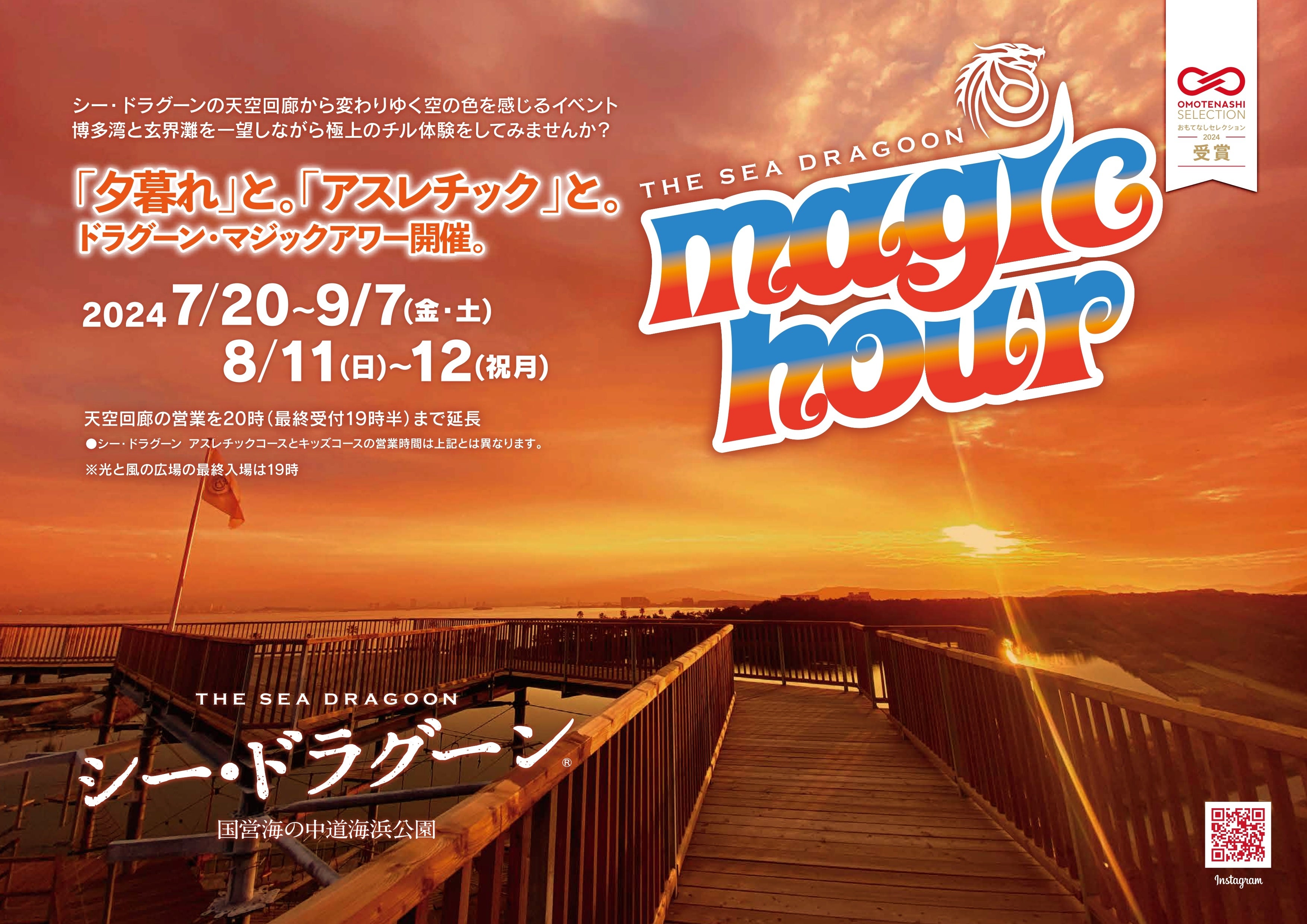 株式会社SEアミューズメント(横浜市中区)のプロデュースする九州唯一のアスレチックタワー「シー・ドラグーン」(国営海の中道海浜公園 光と風の広場)は、この夏、天空回廊の営業時間を20時まで延長し、夕陽から夜景に変わる風景や時間を感じることができる「ドラグーン・マジックアワー」を開催いたします。博多湾や玄界灘を一望できる天空回廊で夏の夕涼みを楽しむことができます。