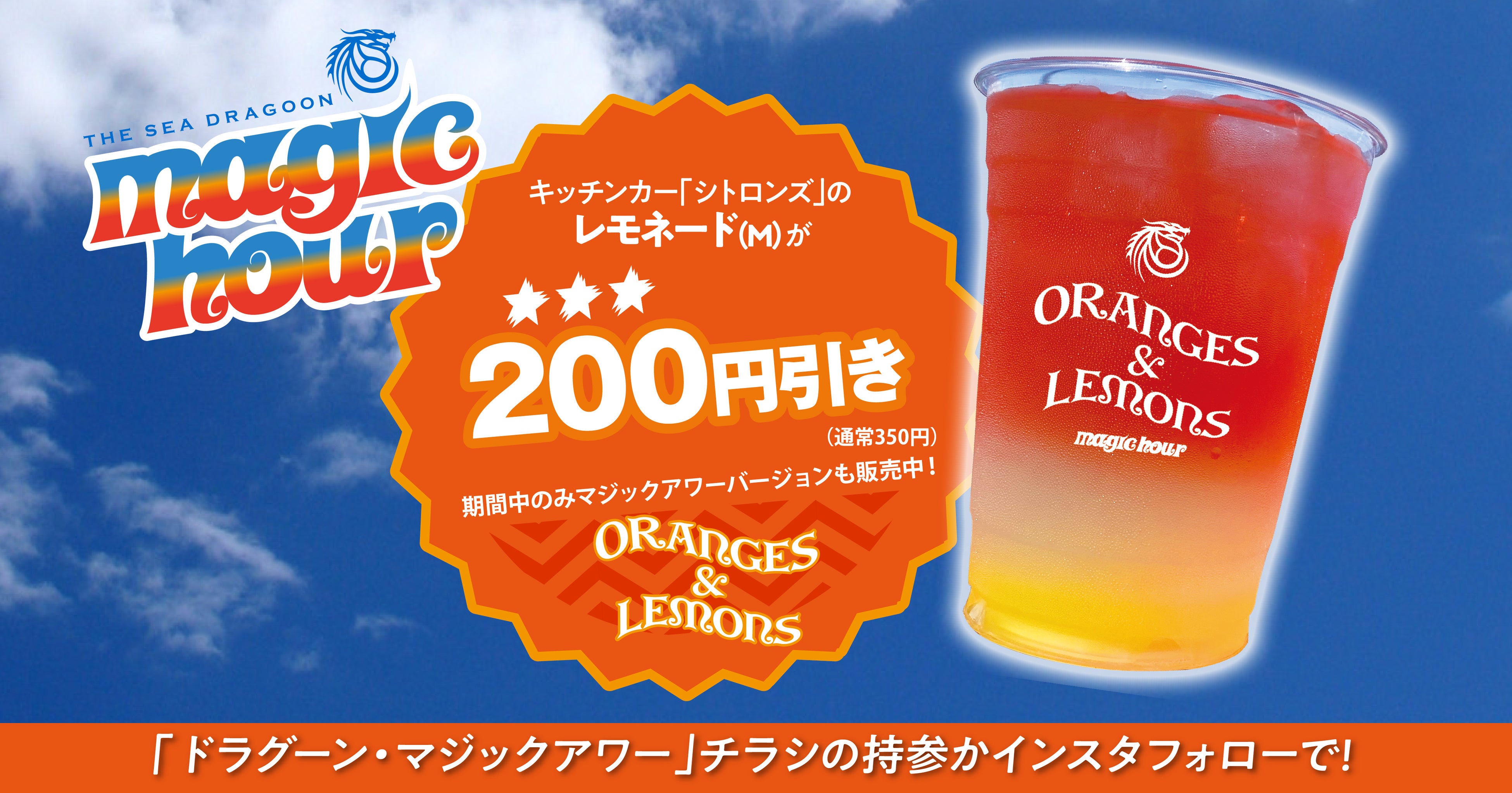 ドラグーン・マジックアワーの開催期間中、キッチンカー「シトロンズ」にて、夕陽をイメージした特別バージョンのレモネードを販売。園内に設置されているドラグーン・マジックアワーのチラシの持参かシー・ドラグーンのインスタアカウントのフォローでレモネード(M)が200円引きに。