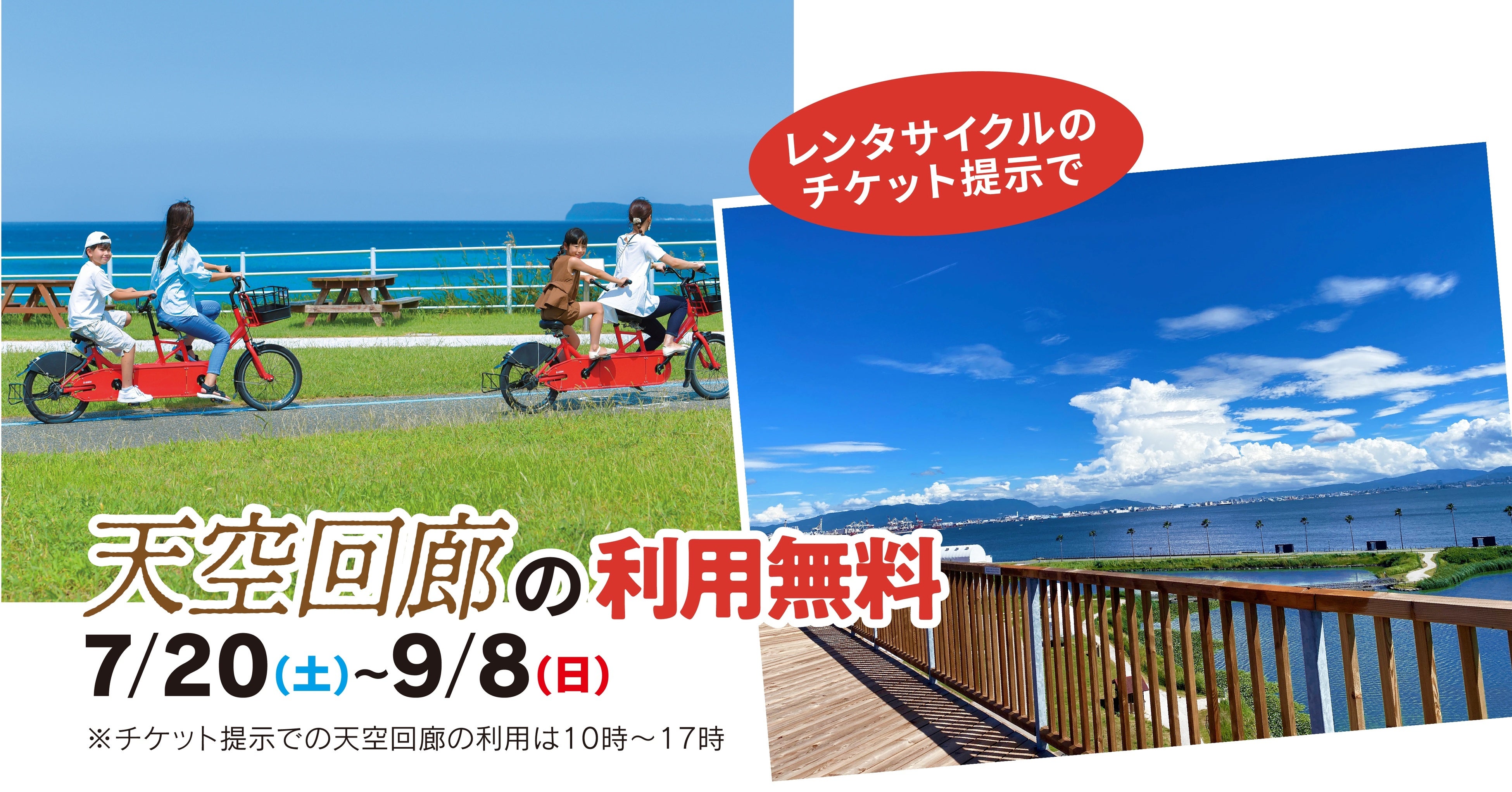 2024年7月20日(土)~9月8日(日)の間、海の中道海浜公園のレンタサイクルのチケットをシー・ドラグーンでご提示いただけると通常500円の天空回廊の利用が無料となります。