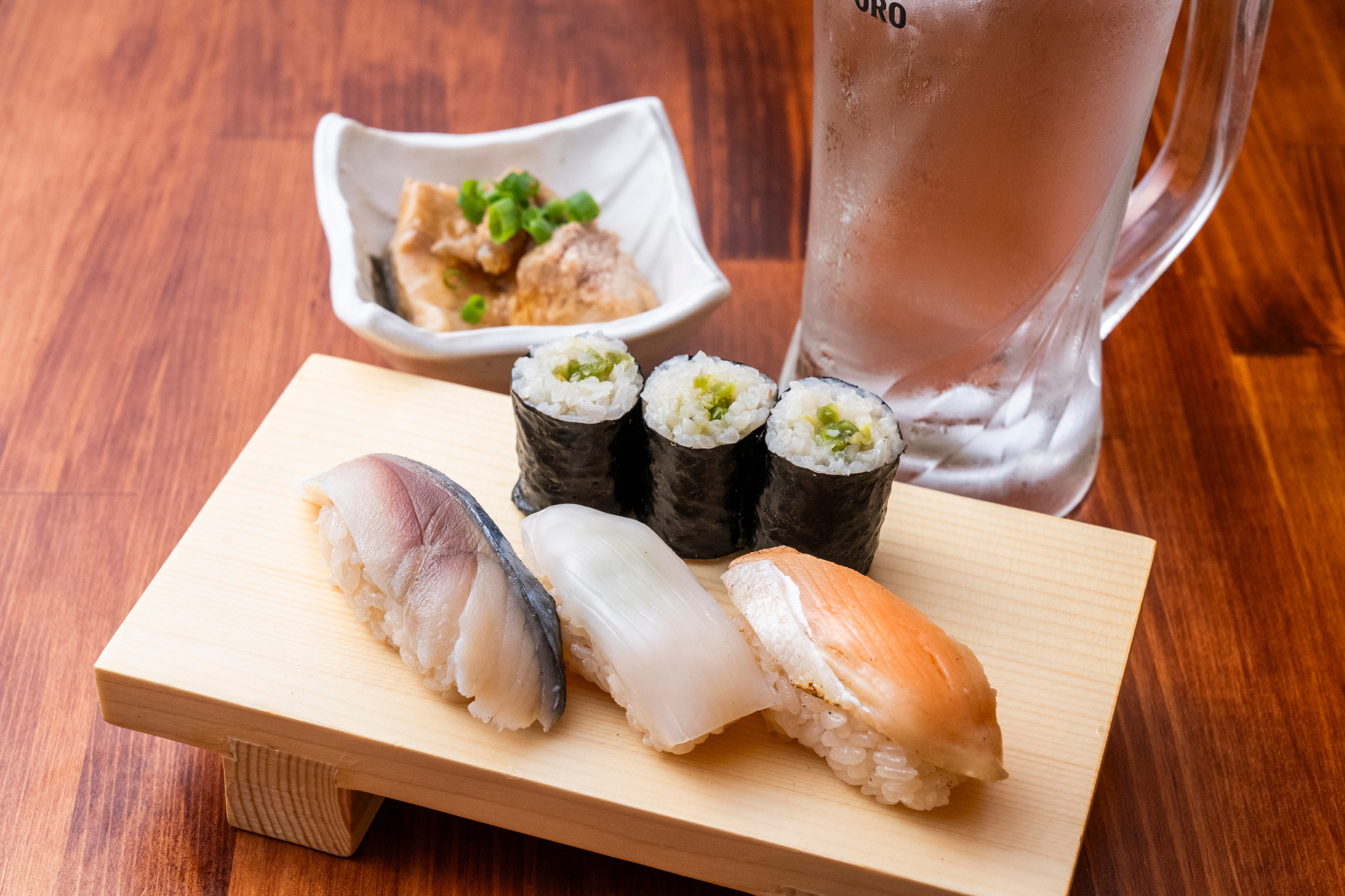 (サワーまたはハイボール1杯、小鉢、にぎり3貫、選べる手巻き)