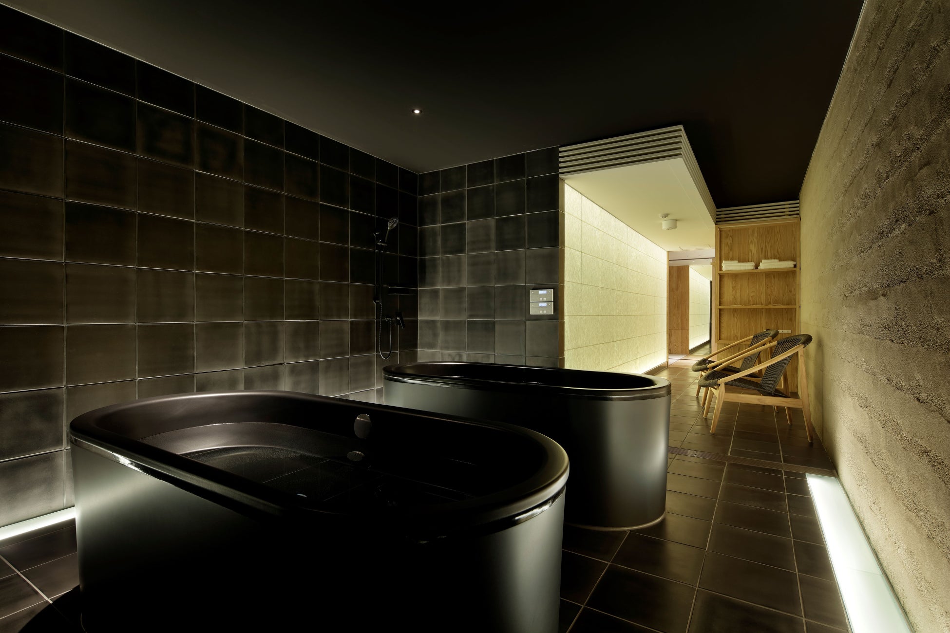 またこれまでに無かった特徴としては、1つの客室内に、まったくコンセプトの異なる2種類のお風呂を設置していることです。は、部屋の両端に2箇所に位置するお風呂は、それぞれ設置をしており、それぞれにまったく設えを異ならせており、「鎮静」と「開放」をテーマとして設けております。