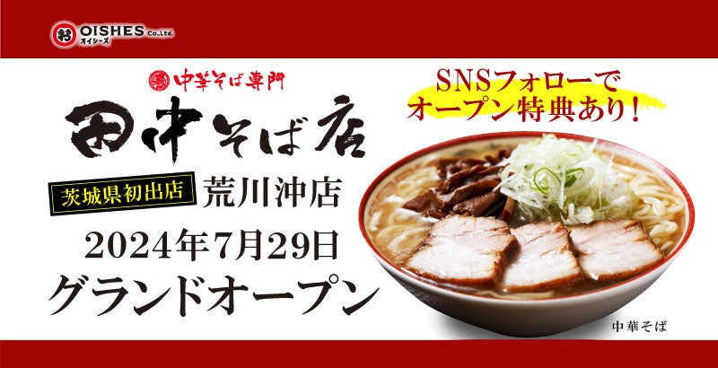 オイシーズ、茨城県初出店「中華そば専門 田中そば店 荒川沖店」7月29日(月)グランドオープン!