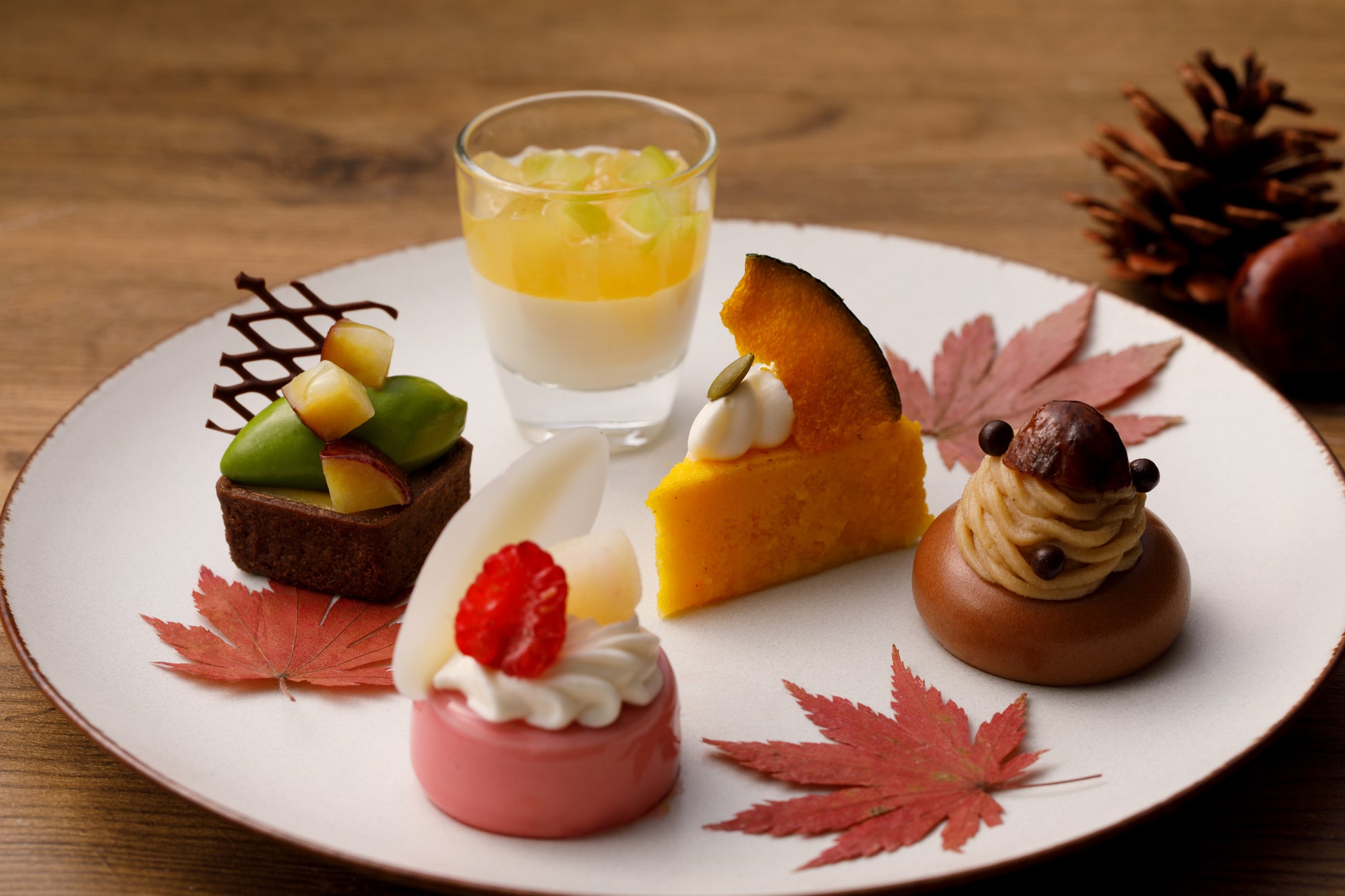 スイーツ:紅はるかのパンナコッタ 林檎とシャインマスカットのジュレ(ハロウィンバージョンはクランベリーのジュレ)、かぼちゃのチーズケーキ、栗とビターチョコレートのムース、ラズベリーと洋梨のムース、紅はるかのスイートポテトタルト 基山茶玉露のクリーム、栗のフォンダンショコラ 基山茶玉露のアイスクリーム(ハロウィンバージョンはベリーのアイスクリーム)