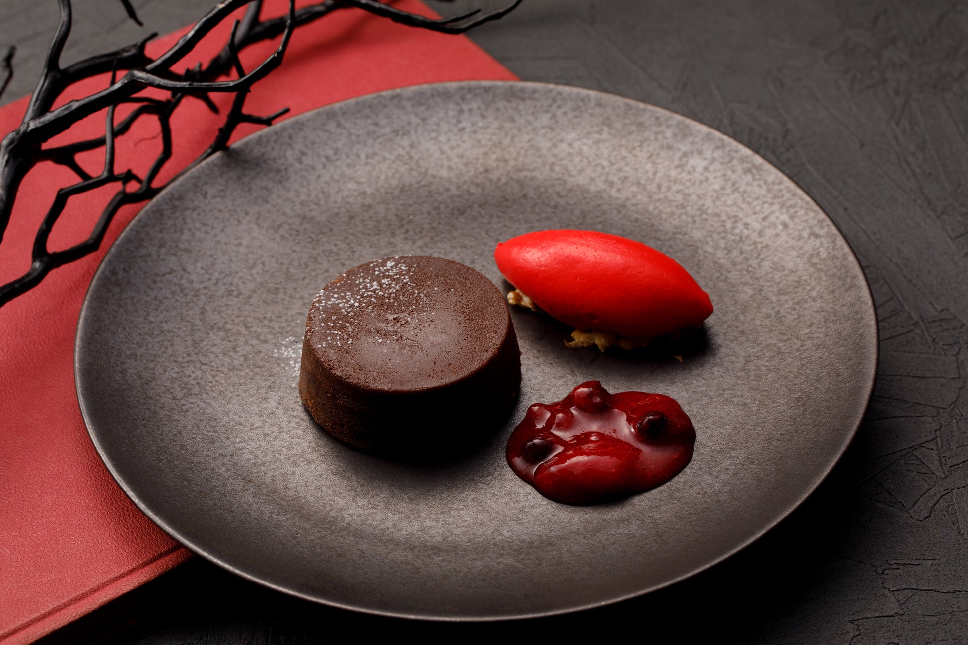 フランス産ビターチョコレートを使用したフォンダンショコラに栗のコンポートを忍ばせました。ハロウィンバージョンではベリーアイスとともにお楽しみください。