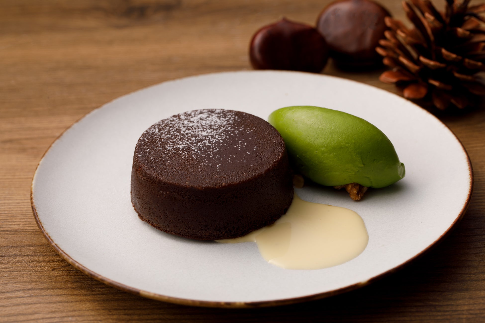 フランス産ビターチョコレートを使用したフォンダンショコラに栗のコンポートを忍ばせました。基山茶玉露を使用したアイスクリームとお楽しみください。