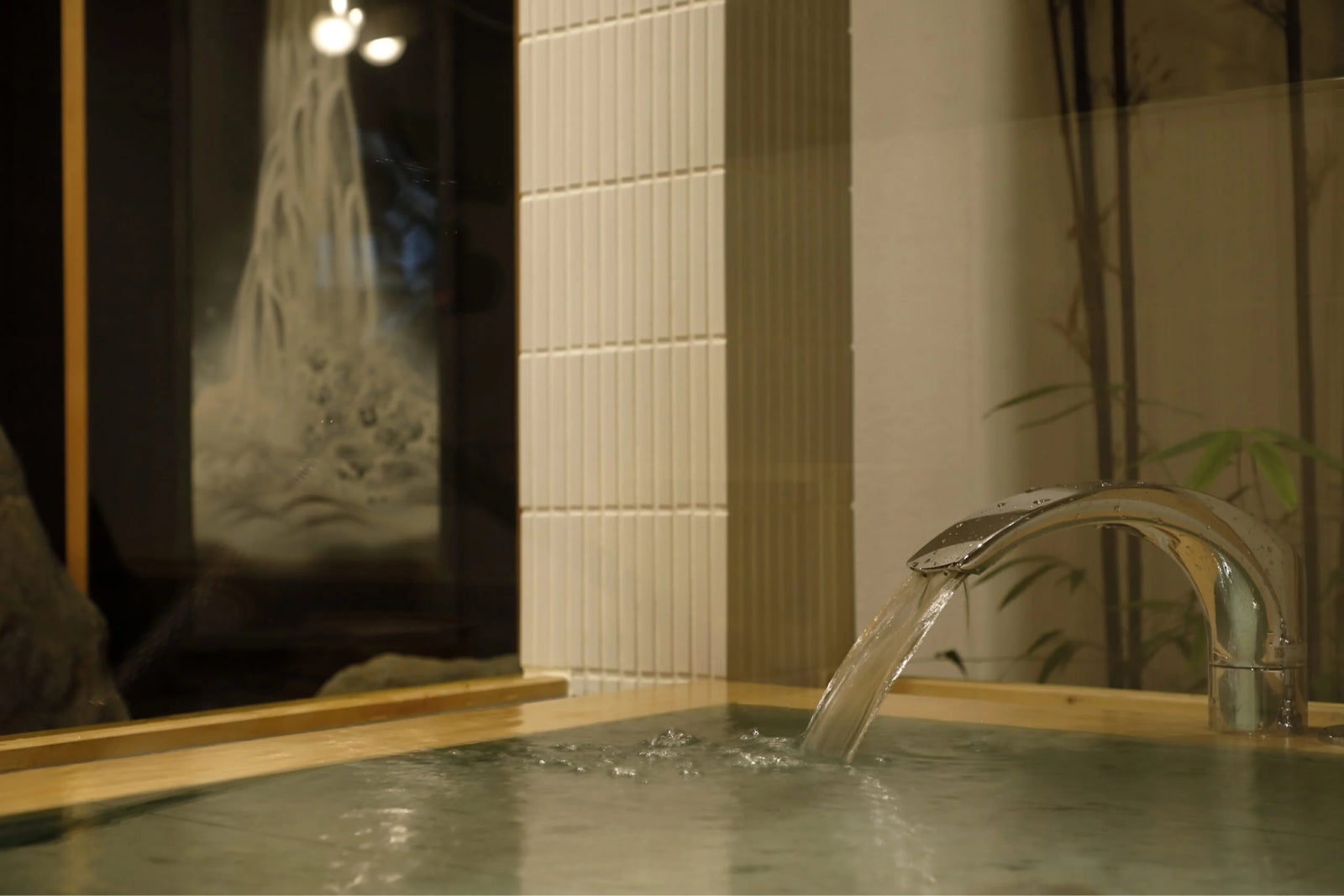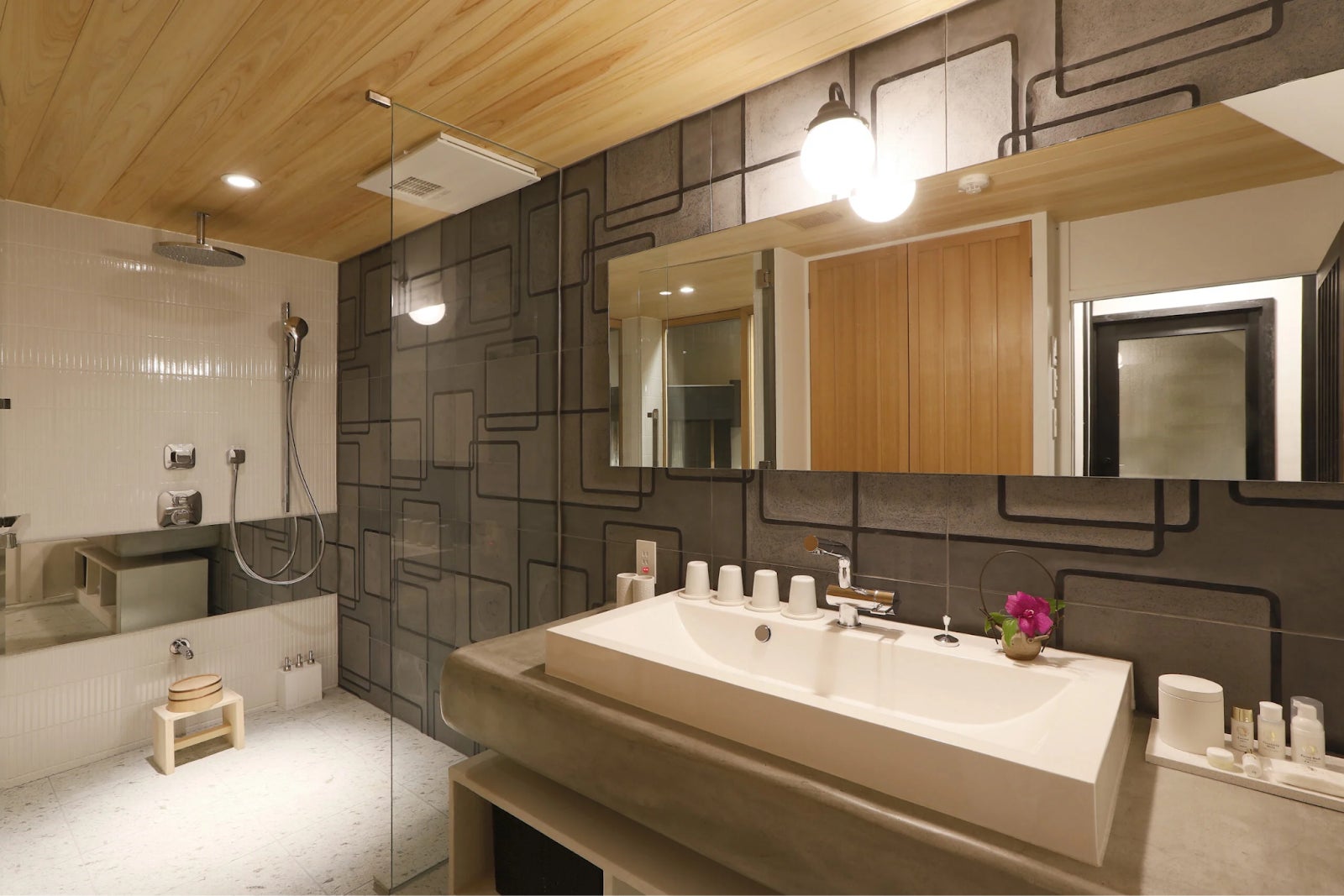 また浴槽から見える坪庭には小さな日本庭園を設えてあり、湯船でリラックスしながら日本の自然美を楽しむこともできます。金色をベースとしたきらびやかで非日常的な空間でありながら、そのなかで過ごせばゆったりと心落ち着く宿に仕上がっています。