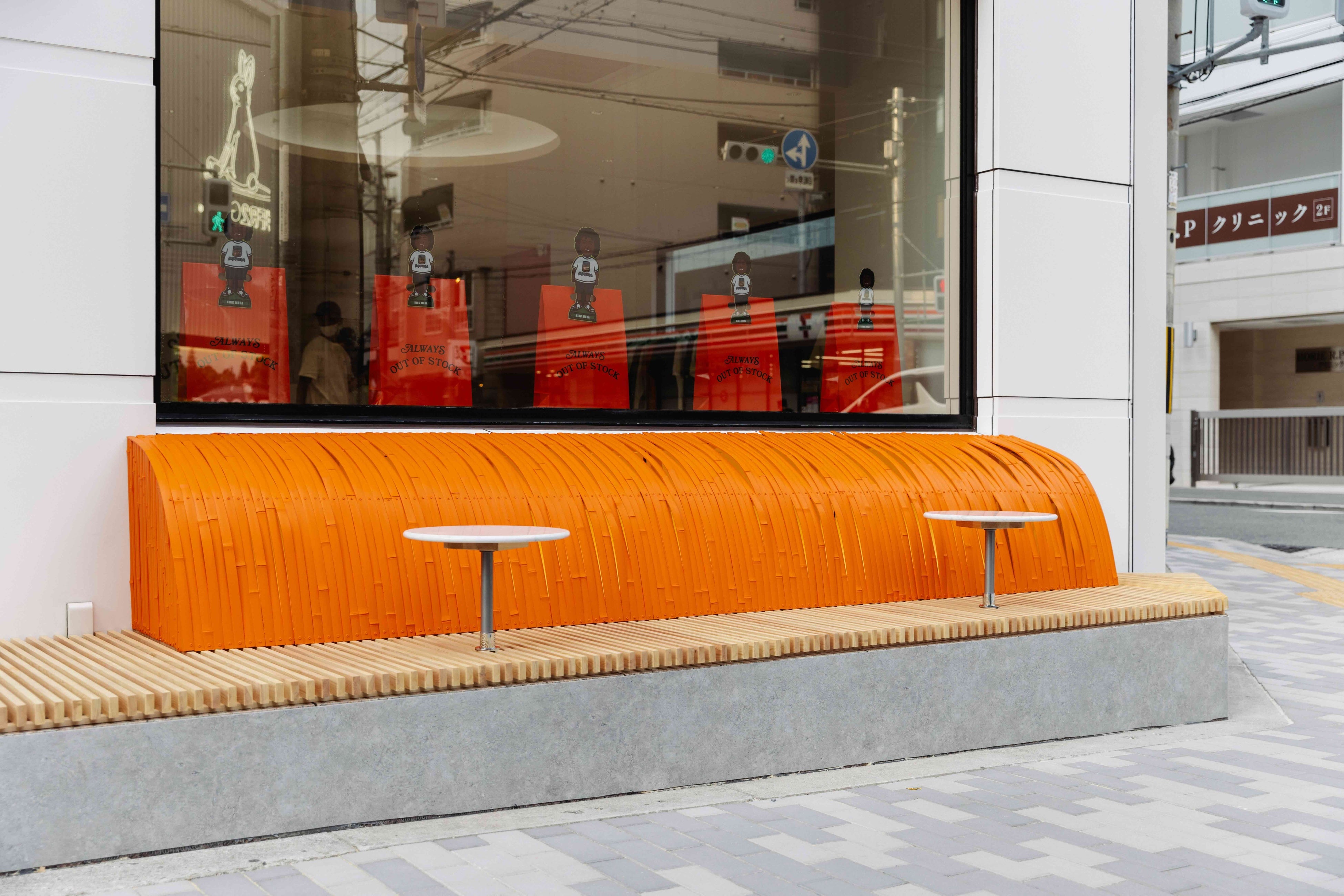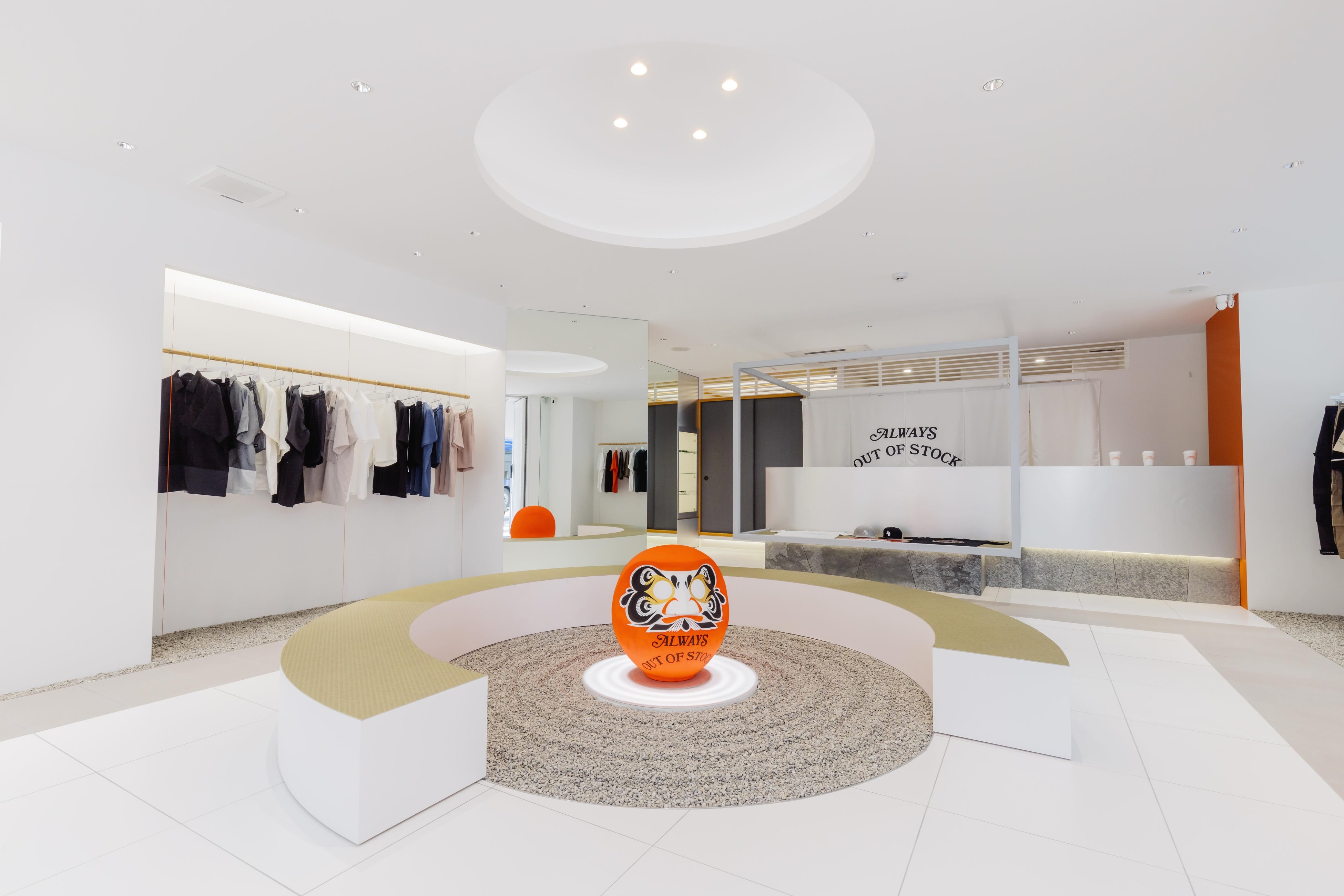 本店舗は、白を基調とした内装に差し色としてブランドのコンセプトカラー“オレンジ”を使用。店内のハンガーラックは竹で統一し、中央には枯山水をディスプレイ。店外には腰をかけてカフェを楽しむことができるデッキと京都の町屋を彷彿させる犬矢来を設置いたしました。ディレクターKING-MASAの出身地・京都のエッセンスを取り入れることで、和とモダンを組み合わせた近未来感漂うデザインに設計されております。店内にはVIP ROOMも用意しており、ALWAYS OUT OF STOCKの商品展開のみならず、カルチャーやコミュニティー作りになるようなイベントを開催するコンセプトショップとして発信してまいります。