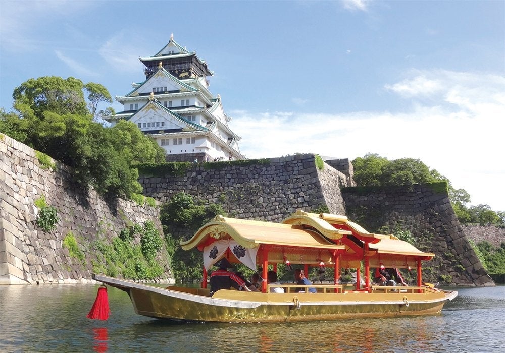 金箔を多用した船は豊臣秀吉の「鳳凰丸」を参考に再現。大阪城内壕を約20分で遊覧します。乗り場は極楽橋横。電話番号 06-6314-3773